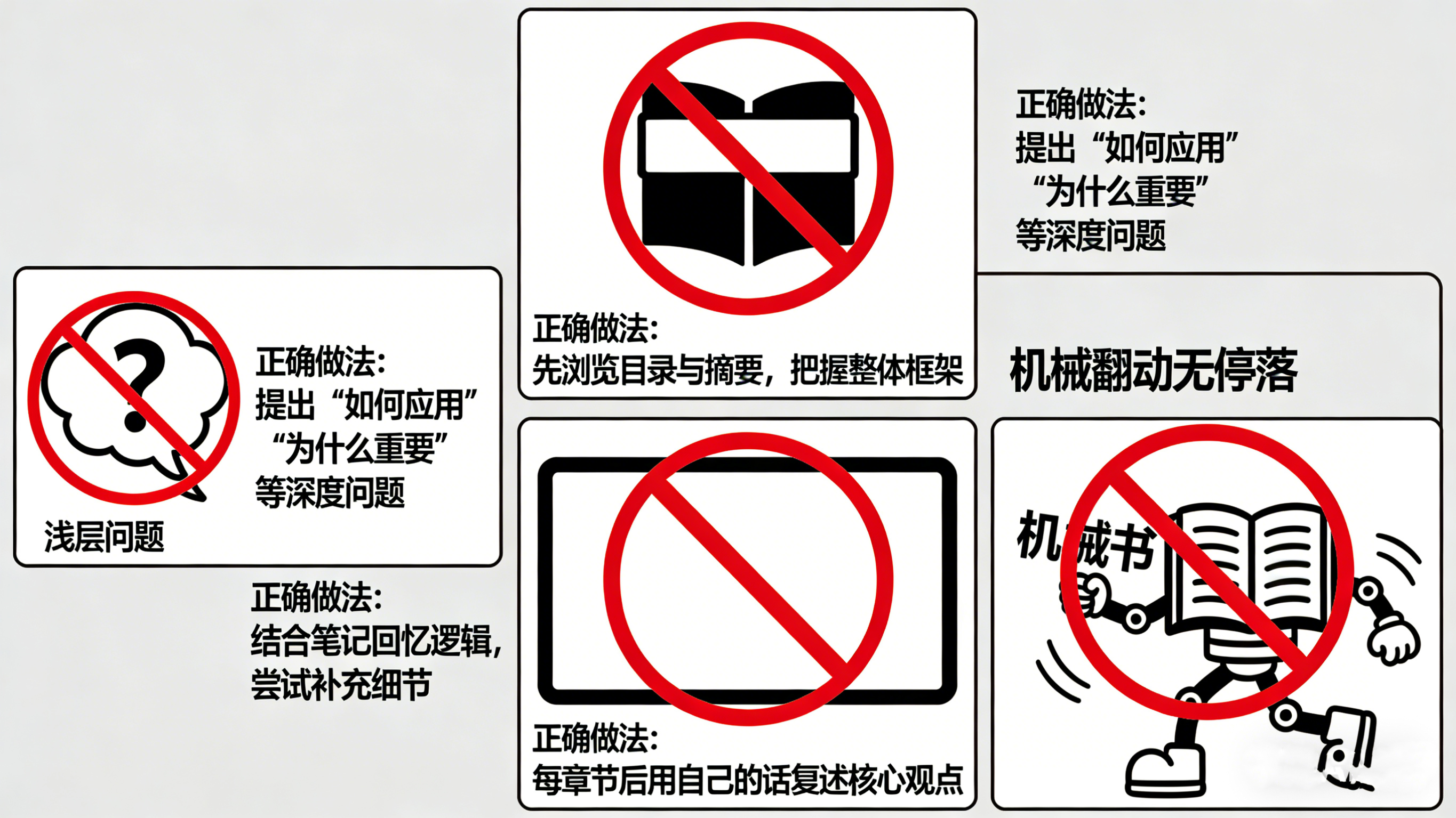 跳过“概览”直接精读:很多人觉得“概览浪费时间”,直接从第一章开始逐字逐句读,结果读了一半还不知道书的核心主题,越读越迷茫。记住:概览是“节省时间”的关键,不是“浪费时间”。
