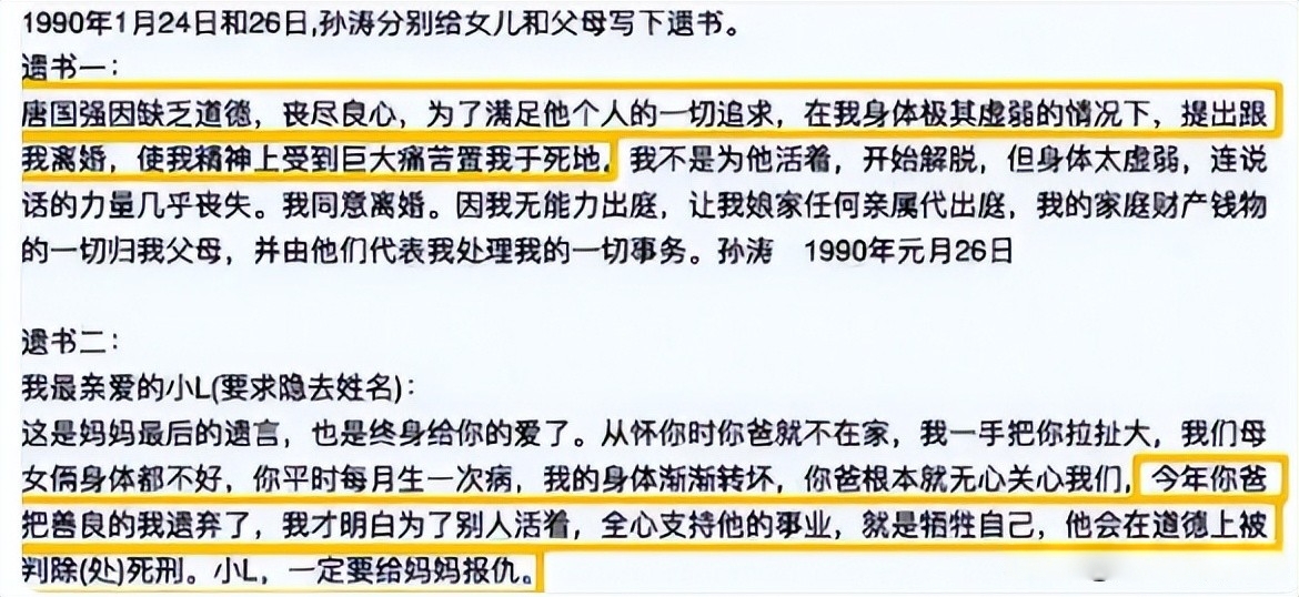 出事以后,家里翻出了两封她留下的信,一封是写给父母的,里面话说得很重,说唐国强不讲良心,在她身体很差的时候还提离婚,让她精神上受了大刺激,还把家里钱物都交给爸妈处理。