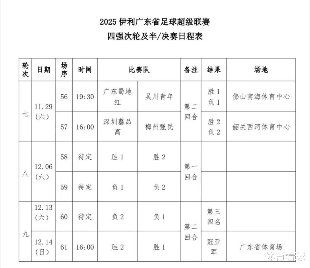 根据赛程安排,广东省超决赛为两回合制,首回合吴川青年队将于12月6日坐镇湛江奥体中心迎战深圳藝品高,次回合两队将于12月14日移师广东省体育场一决高下。