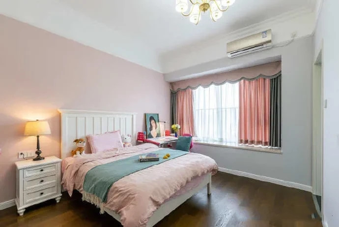 女儿的房间,粉色的设计是应了孩子的要求,而且女生喜欢少女粉,给她一个公主梦,很是舒适和大气。采光非常好,飘窗也增大了室内的收纳空间,本身孩子的房间也不小。