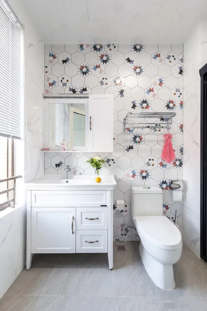 卫生间,做了干湿分区的设计,重点在于它的背景墙用的是花纹的瓷砖作为背景装饰铺贴,很是好看,给人一种置身于童话世界的感觉。白色为主的卫生间装饰更加的好看,定制的洗手台以及镜子柜实用性很强。