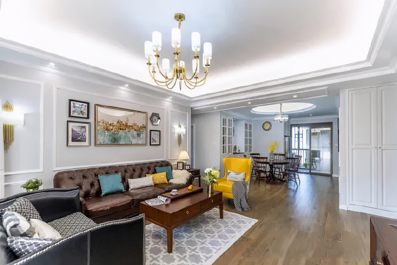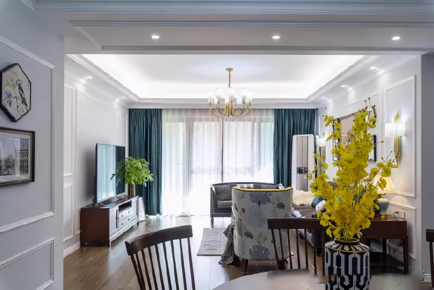 客厅的天花板做了吊顶的装饰,美式风的主灯装饰更加的大气美观,好看极了。