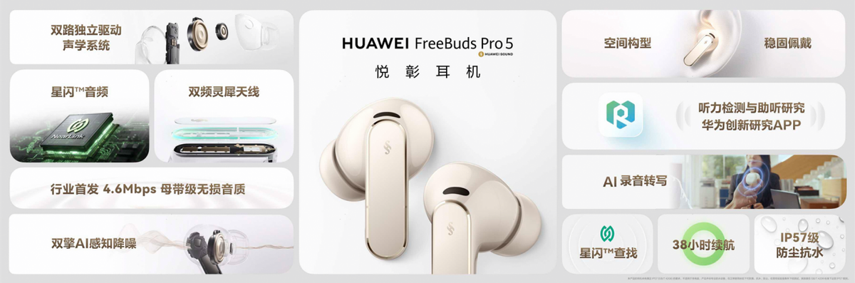 华为FreeBuds Pro 5悦彰耳机采用全新悦彰星环设计,提供四款配色,它是业界首款支持星闪™[8]音频技术的无线耳机,其搭载华为自研第三代音频芯片,配合L2HC 5.0协议,最高传输速率可达4.6Mbps,可聆听96kHz/24bit母带级无损音源。耳机同时是全球首款双擎AI感知降噪耳机,采用业界首个双单元双路主动降噪架构,降噪效果最高提升至220%。华为FreeBuds Pro 5用户在“华为创新研究APP”加入听力检测与助听研究[9]后,耳机可居家进行听力检测并为中轻度听损用户提供听力补偿。同时,FreeBuds Pro 5新增AI录音转写功能[10],支持实时转写并生成摘要、待办事项。