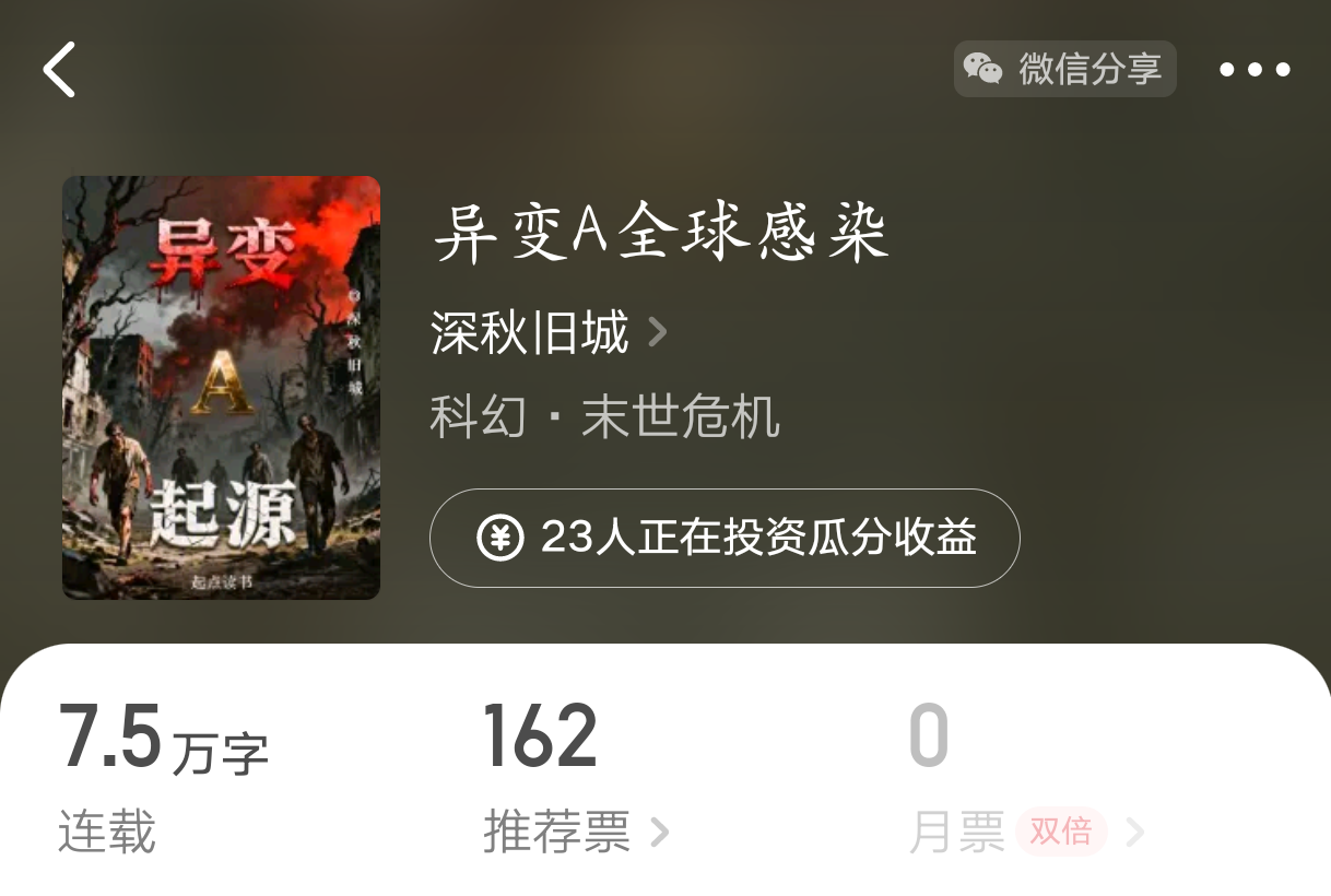 (目前)没有异能的末世丧尸文,主角和他的好兄弟构成故事最基本的双主角,似乎在慢慢建立自己的团队但目前看不出来啥。