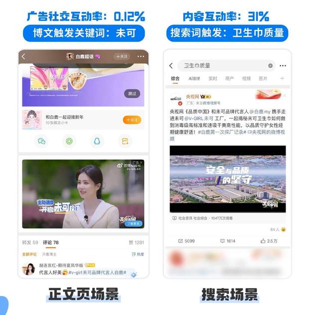 当卫生巾安全话题引发公众关注时,未可卫生巾通过《品质中国》生产实录,配合双场景投放实现公域抢占与私域锁流。当用户主动搜索“卫生巾质量”等品类词时,透明生产流程建立信任制高点,博文互动率达到了31%。与此同时,在正文页中锁定“未可”关键词,品牌科普净化场域内容,社交互动率0.12%。双管齐下,形成品牌好感的“护城河”。
