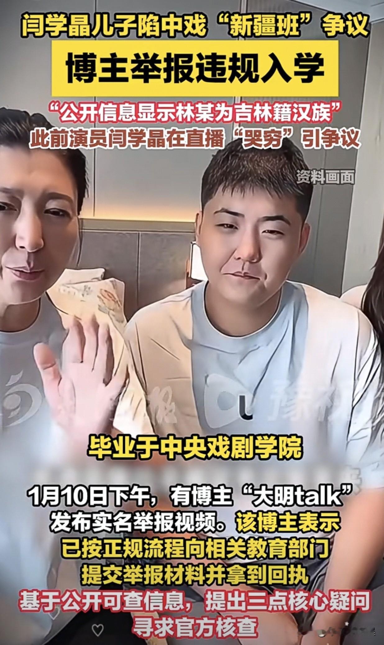 中央戏剧学院通报“演员闫学晶儿子被举报违规入学”:网传信息不属实! 演员阎学晶近期因直播言论陷入多重争议,其“高考移民”质疑、“哭穷”风波及账号受限事件引发全网对教育公平、明星特权与公众人物责任的讨论。 另外阎学晶在直播中透露儿子林傲霏因“新疆班分低”考入中央戏剧学院,引发轩然大波。 中戏新疆班作为扶持少数民族艺术人才的专项计划,要求考生具备新疆户籍/学籍及双语能力,每年仅招20人。但公开信息显示: 林傲霏为吉林籍汉族,无新疆就读经历;阎学晶全家拥有北京户口,儿子长期在北京生活。 网友质疑其通过特权挤占新疆考生名额,已有博主实名举报至教育部门要求核查入学合规性。 1月10日下午,有博主“大明talk”发布实名举报视频。该博主表示,已按正规流程向相关教育部门提交举报材料并拿到回执,基于公开可查信息,提出三点核心疑问,寻求官方核查。 这不就在1月11日,林某霏,男,汉族,2012年北京市高中应届毕业,以户籍地北京生源身份报考我院,先后参加我院本科招生专业考试和普通高等学校招生全国统一考试,被录取至我院表演系2012级戏剧影视表演普通本科班。2012年我院未招收新疆班,网传信息不属实。 闫学晶儿子入学真相 对此你怎么看?欢迎留言交流!