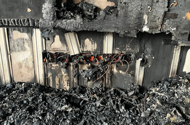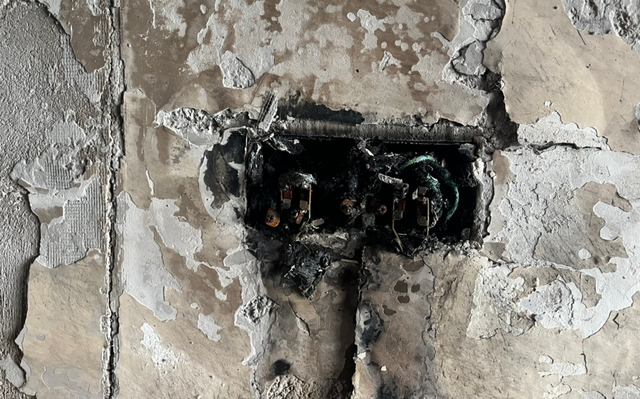 主卧床头边插板上的手机充电器残骸。图源:贵州消防