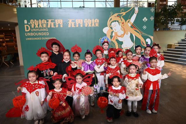 1月11日,在甘肃省敦煌市敦煌无界,十余名小朋友以走秀方式,展示自己创作的剪纸服饰作品,感受非遗魅力。