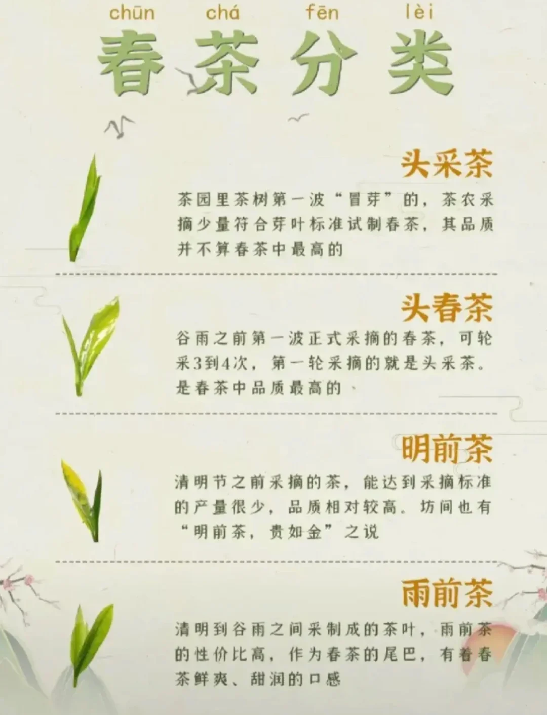 依据季节变化和茶树新梢生长的间歇,茶叶分为春茶、夏茶、秋茶、冬茶,它们犹如燕瘦环肥各有风韵。常见的说法是“春鲜、夏涩、秋香、冬甜”,这些仅是大体的差异,具体还要看做成的相应茶品的品质。