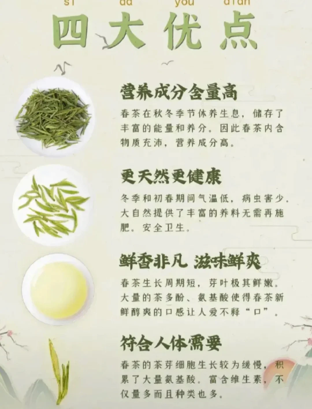 春茶由于茶树营养物质丰富,茶芽肥硕,内含物质丰富,鲜爽度、饱满度和协调度都很高。通常各大茶类的名优茶基本都以春茶为佳。