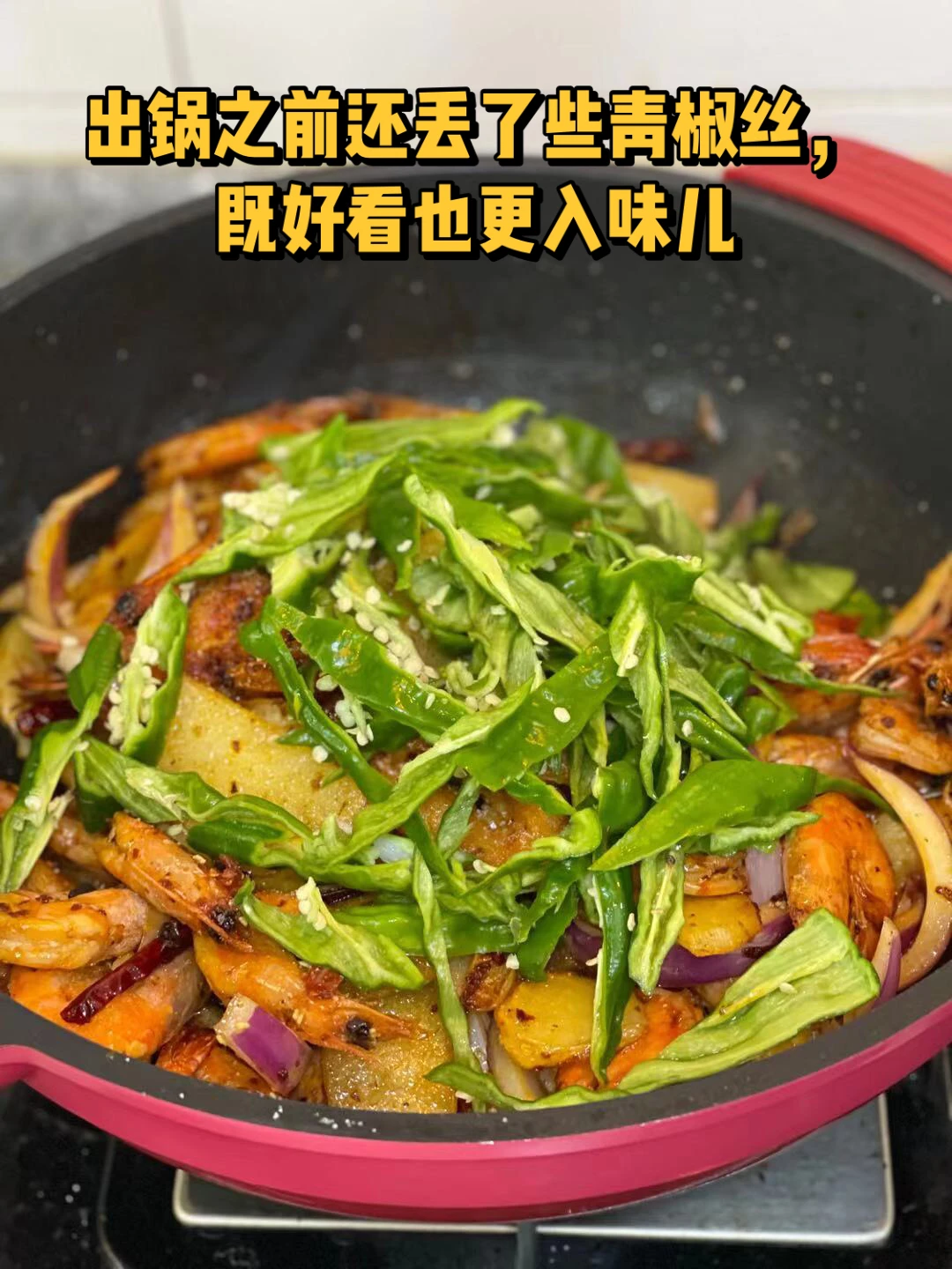 8.出锅之前还放了些青椒丝儿进去,不仅更好看更入味儿呢,出锅前撒少许白芝麻