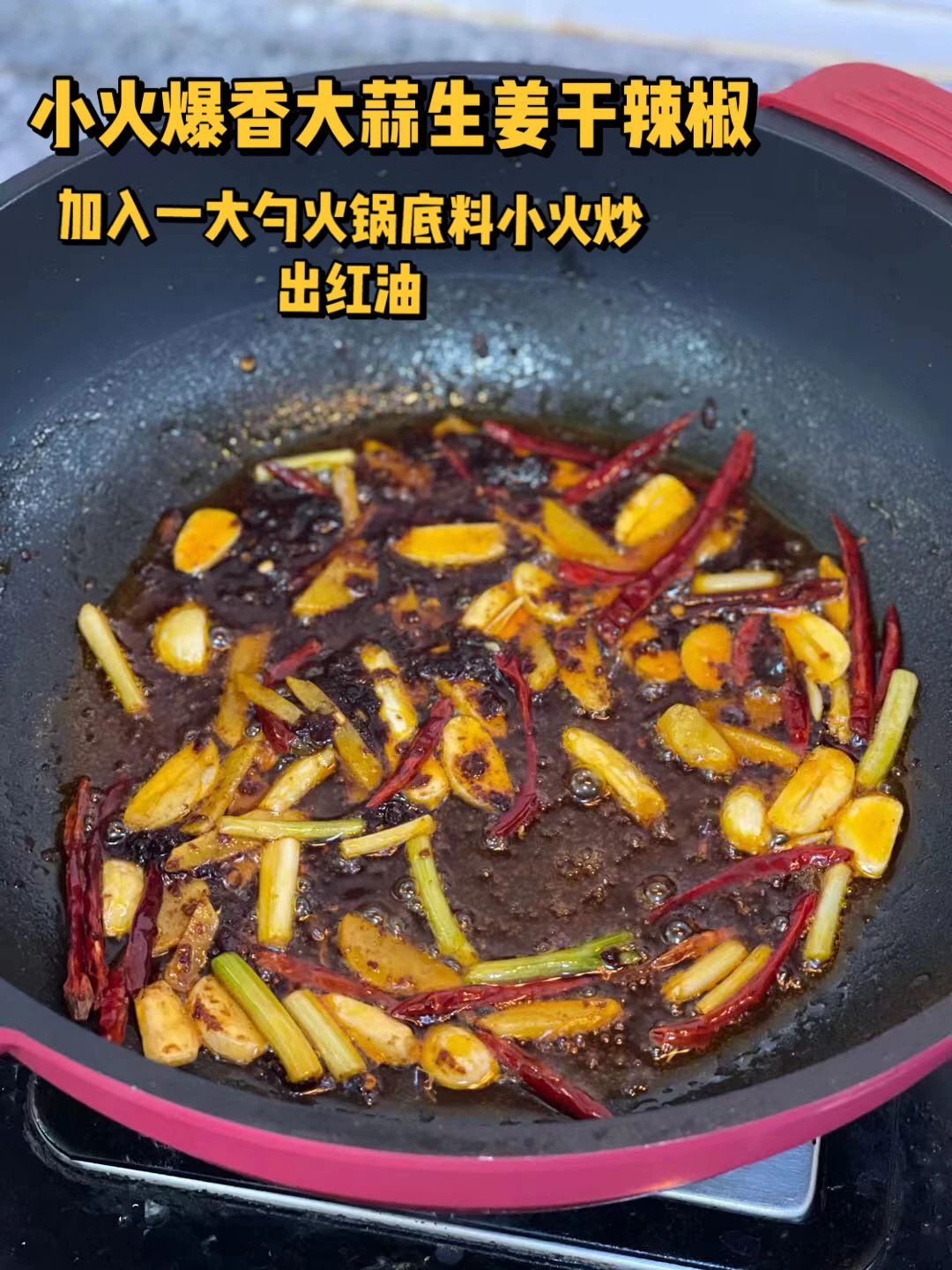 5.小火爆香大蒜生姜沫干辣椒段,加入一大勺火锅底料小火炒出红油