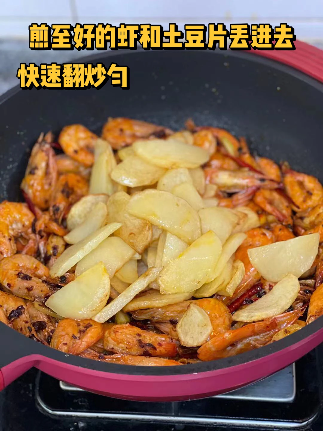 6.煎制好的虾和土豆片丢进去快速翻炒匀