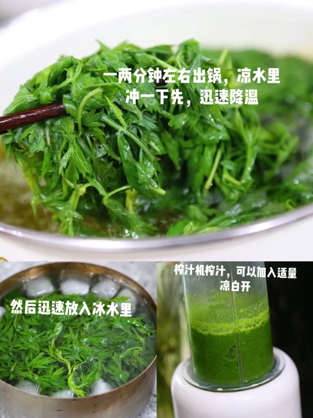 13.提前准备好冰水,煮过的叶子放在越凉的水里叶子就会越绿呀