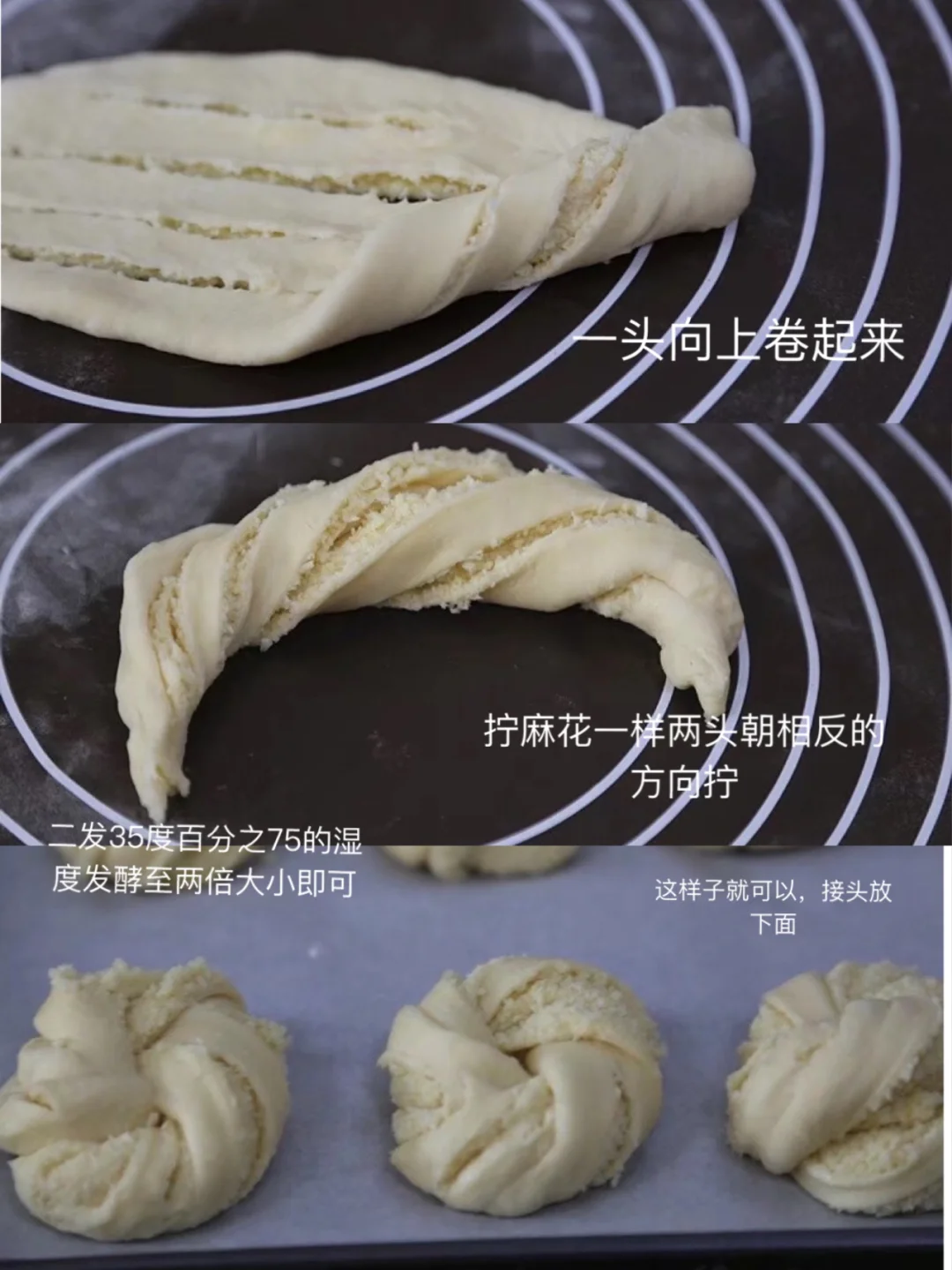 16.轻轻拿起面团一头,慢慢拉长一些像一个方向扭两圈左右