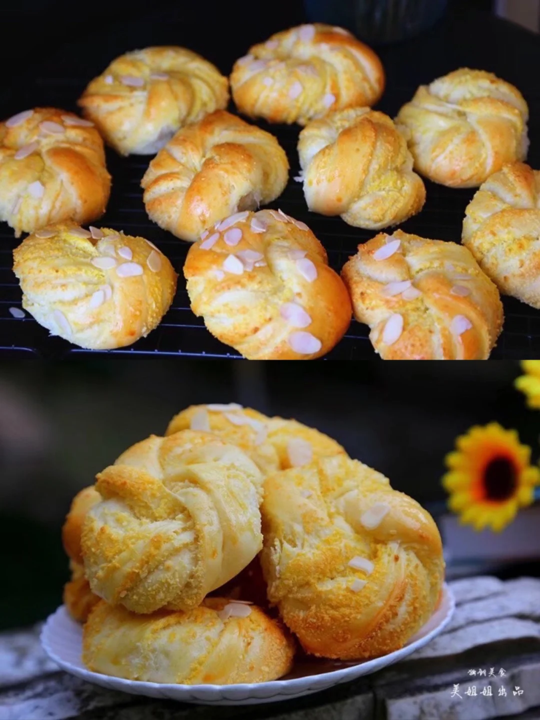 21.烤箱提前预热上火165度下火175度 我家是风炉,用155度烤的,来,看看看看,超级美的颜色有木有,先别管,拿一个撕开就开吃,椰蓉的香味儿真的太喜欢了 超级柔软,给你们看一下里面的组织