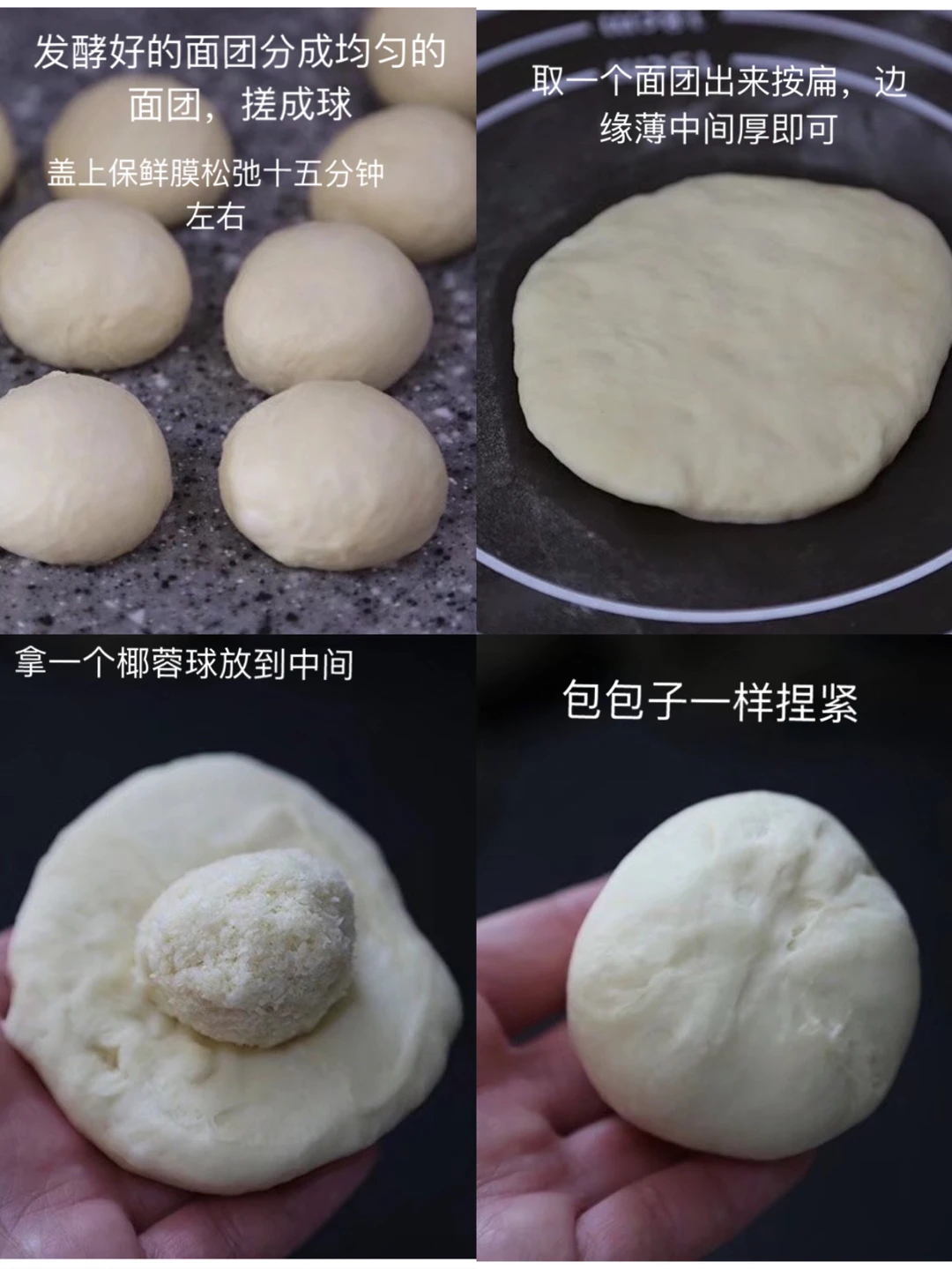 11.按滚圆的顺序,先滚圆的先做,擀成中间厚边缘薄,椰蓉馅儿放在中间