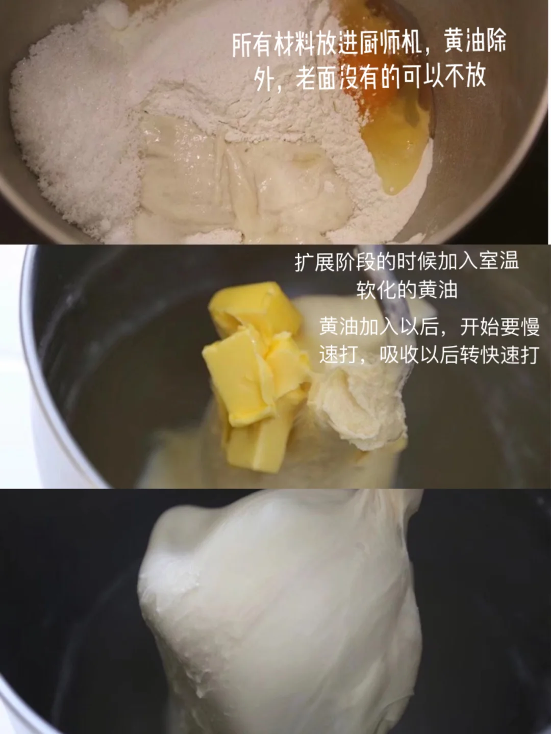 2.打至面团光滑也就是扩展阶段的时候加入黄油 刚开始慢速打,等油差不多吸收的差不多的时候转快速打