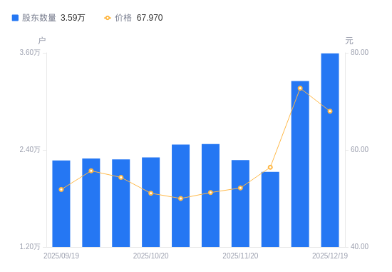 日期A股户数(户)流通A股户均持股数(股)户均持股市值(万元)2026-01-093202421647.64165.392025-12-193592719295.90131.152025-12-103251621320.09155.022025-11-282127832580.31183.852025-11-202274230482.98159.032025-11-102472428039.31143.622025-10-312467228098.41140.492025-10-202307930037.87153.432025-10-102282930366.81165.012025-09-302294530213.29168.29