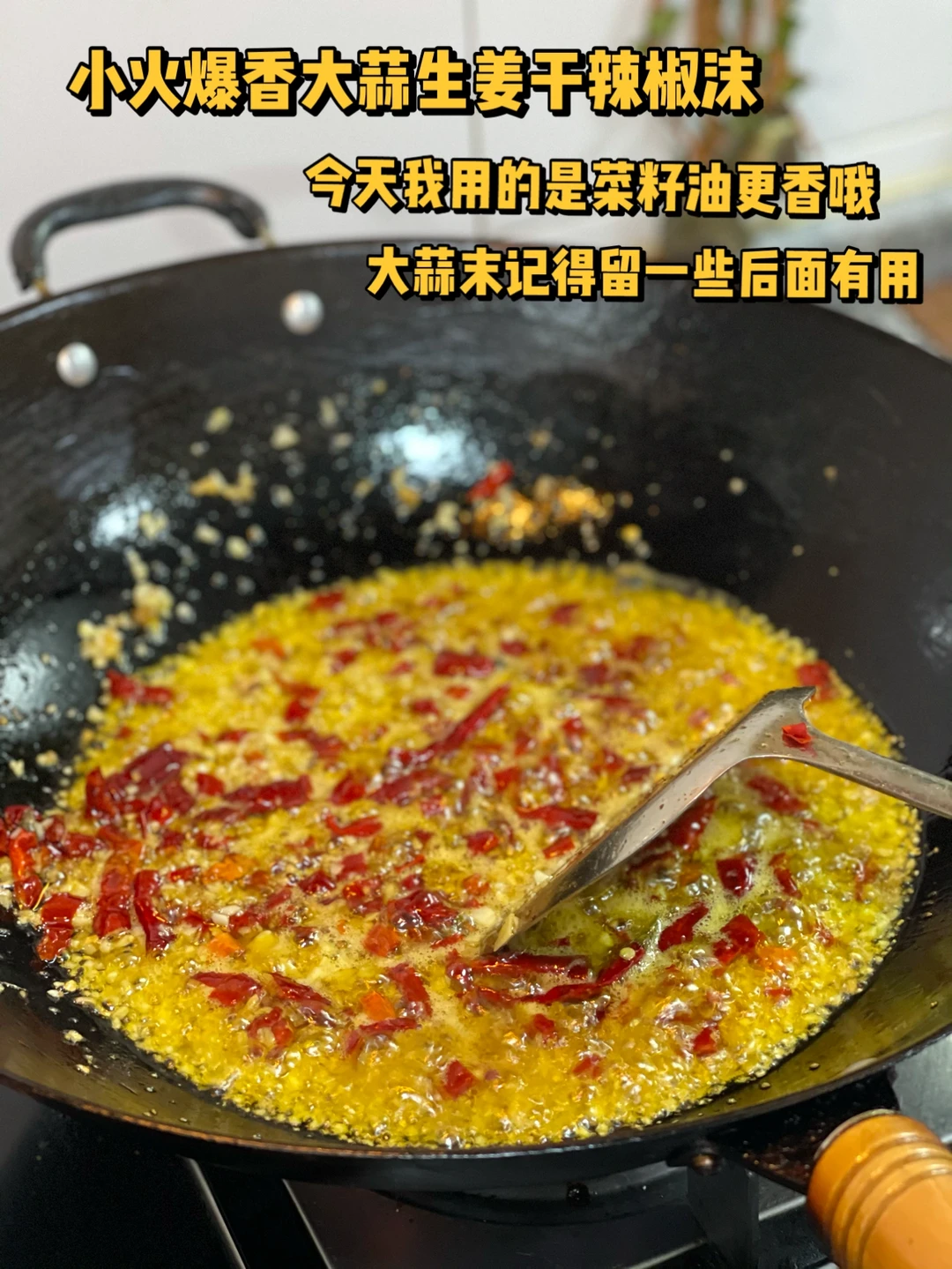 另起锅放油小火爆香大蒜生姜块,放入多一些的干辣椒,香料丢进去小火炒(八角,桂皮,花椒草果香果,豆蔻草寇,三奈,家常的就行)