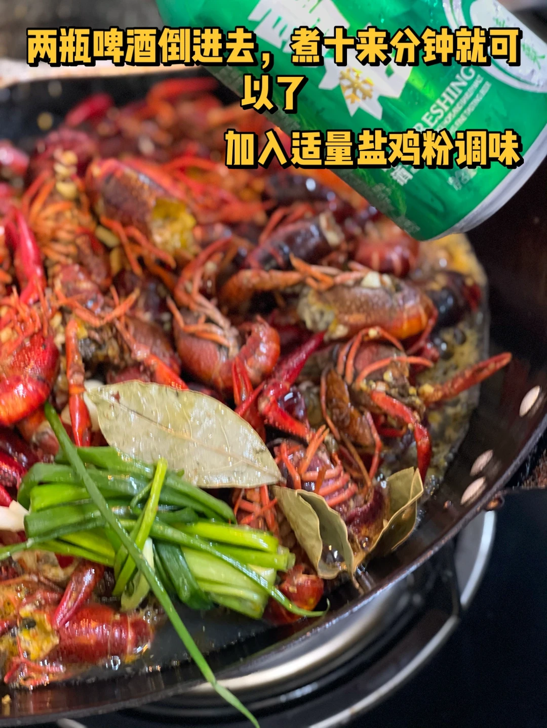 龙虾丢进去快速翻炒至变色,加入八角,香叶葱结,一大勺料酒,一勺生抽倒入两瓶啤酒,大概煮十来分钟就可以了,自己尝一下放少许盐鸡粉调味,煮太久肉质就散了