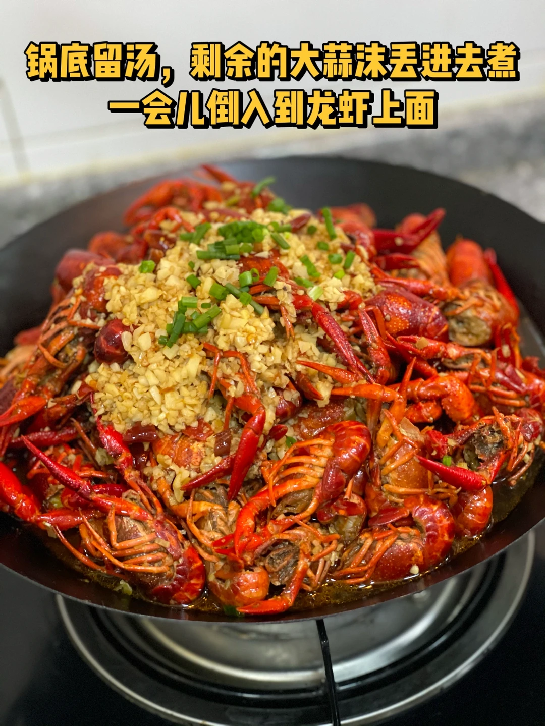 好了以后把龙虾盛出来,汤留在锅里加入刚才另一半大蒜末拌匀煮两分钟