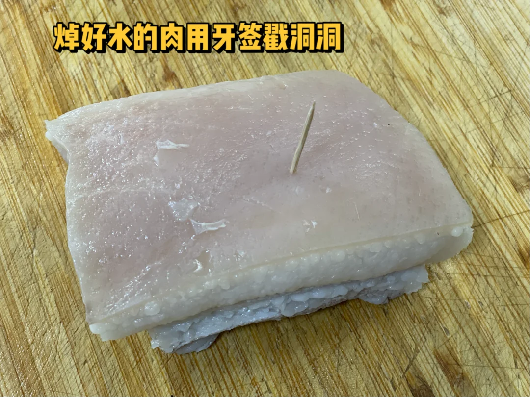 2最好选一块四四方方的肉,我们这里都不行只给你切长条那种,把我气的不行就凑合了,肉冷水入锅一勺料酒生姜片烧开,温水冲净浮沫待用,擦干水份
