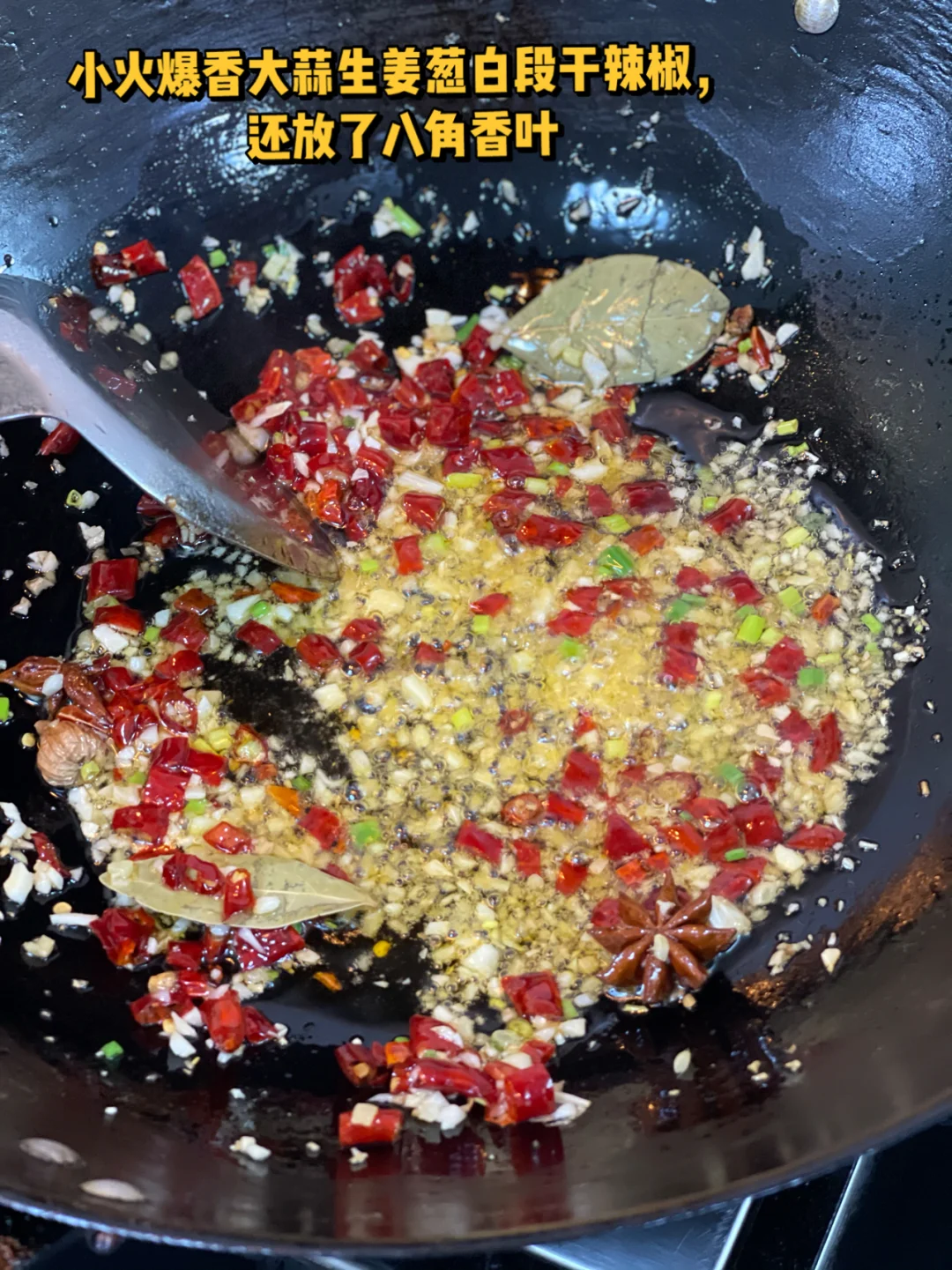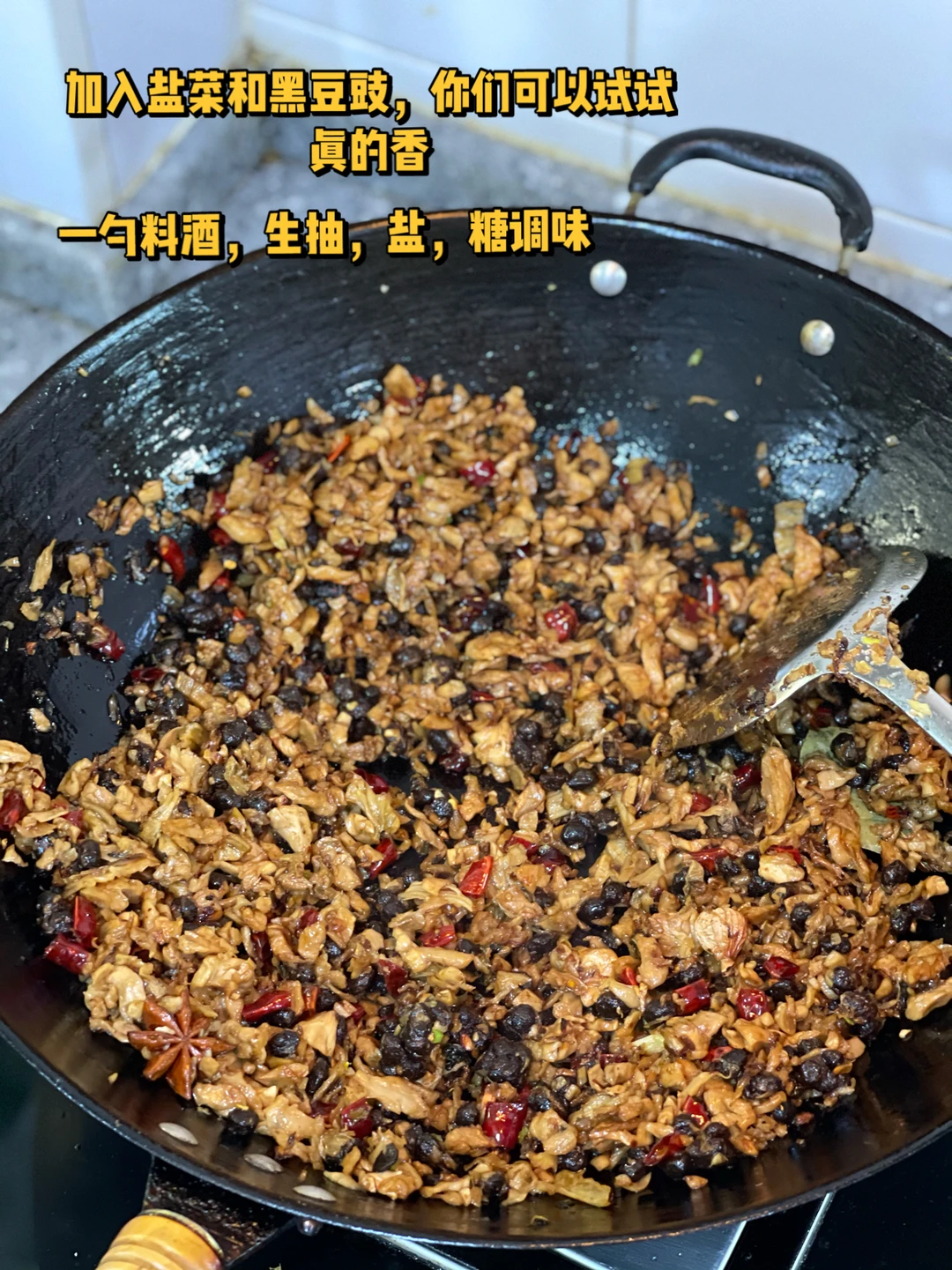 5.锅里放油大蒜生姜葱白段干辣椒小火炒香,还放了八角香叶,沥干水的梅干菜丢进去快速翻炒,我还放了一小袋黑豆豉,更香,一勺料酒,生抽,盐,糖调味