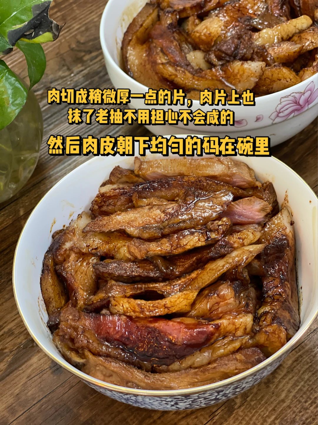 6.弄好的肉切成均匀得稍微厚一点的片状,我还继续在肉片上抹了老抽相信我不会咸的,咸了你来找我,肉皮朝下码在碗底,炒好的梅干菜放进去用勺子压一下