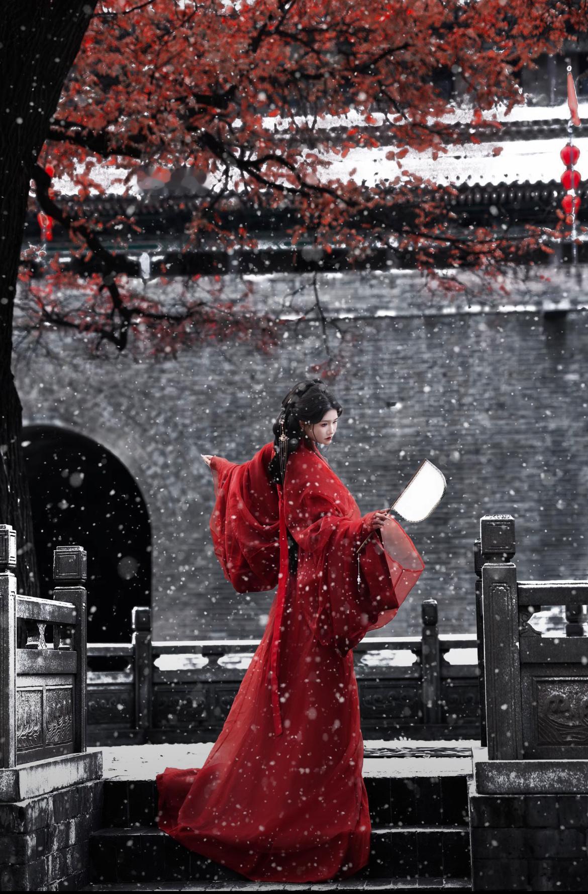 战国袍真是一种极致的东方美学啊,女子身着红色的战国袍,感觉像是古画中的美人走了出