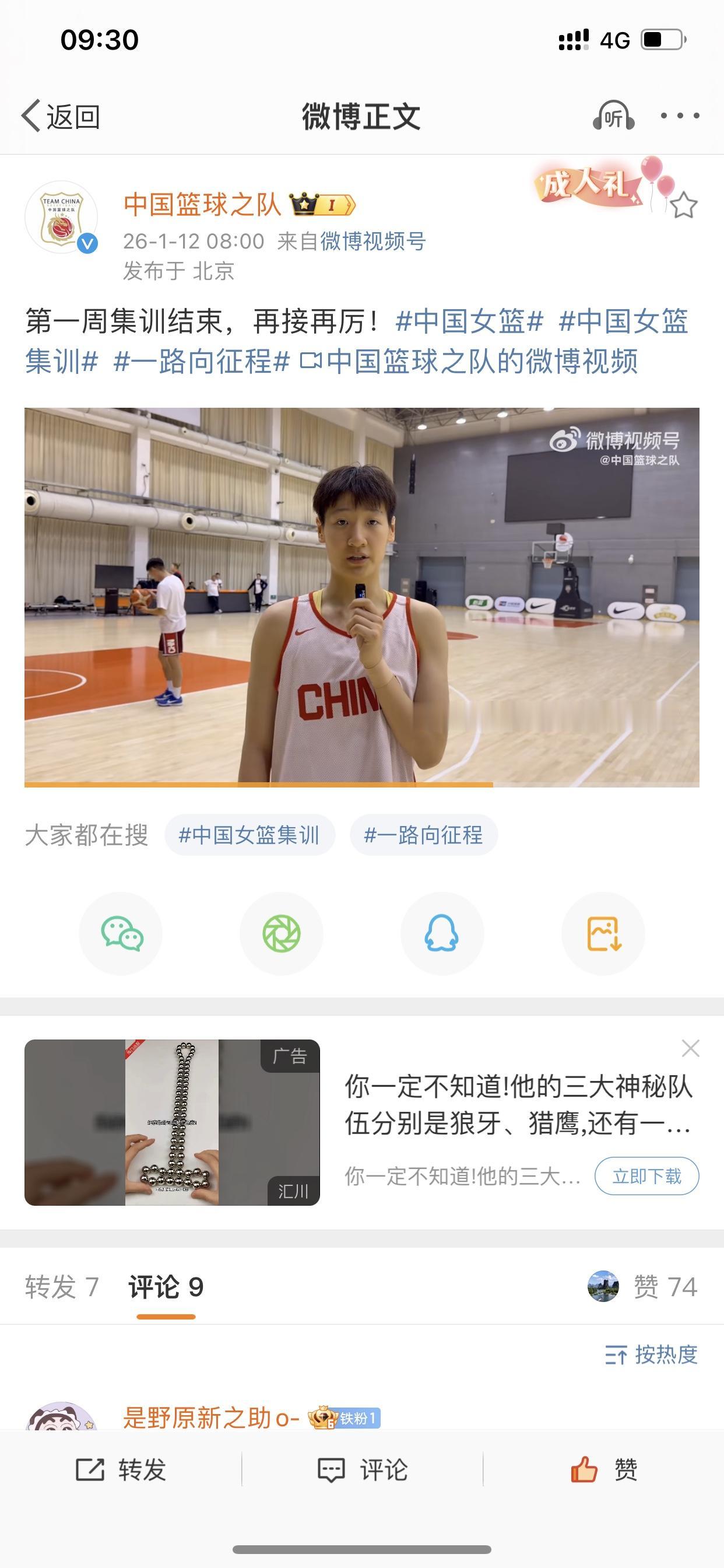 中国女篮国家队更新最新动态! 刘禹彤在列,那些谣言可以停止了,我昨天还刷到说刘禹彤已退出国家队集训的假消息。 通过发布的视频,可以看到天还蒙蒙亮,女篮姑娘们就已经起床开始训练了,可见从这时间上来看,国家队的安排还是很拼的 视频中,中国女篮主教练宫鲁鸣说:“刚刚过去的一周主要是以恢复为主,恢复到国家队战术体系的一个状态当中去,效果还不错!” 中国女篮领队柴文胜则表示:“感谢WCBA各俱乐部对国家队的支持!” 这是一种咱们中国文化的传统精华之一,叫做牺牲小我,成就大我啊! 希望她们能够在未来的女篮世界杯预选赛上如愿挺进正赛!