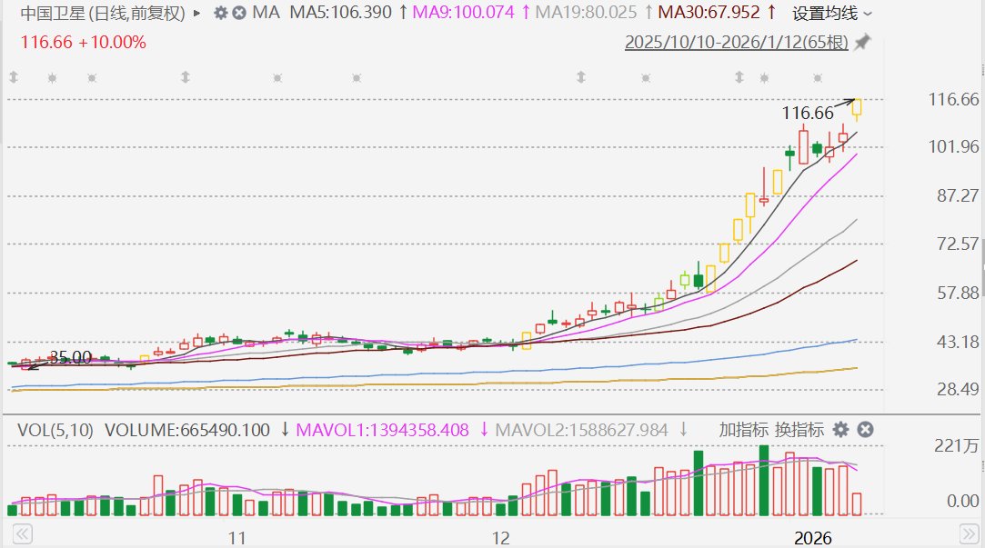 格隆汇1月12日|A股市场商业航天概念股中国卫星(600118.SH)涨停,报价116.66元,再创历史新高,市值升至1379亿元。中国卫星在2025年累涨248%后,在2026年至今的6个交易日内再度累涨近23%。