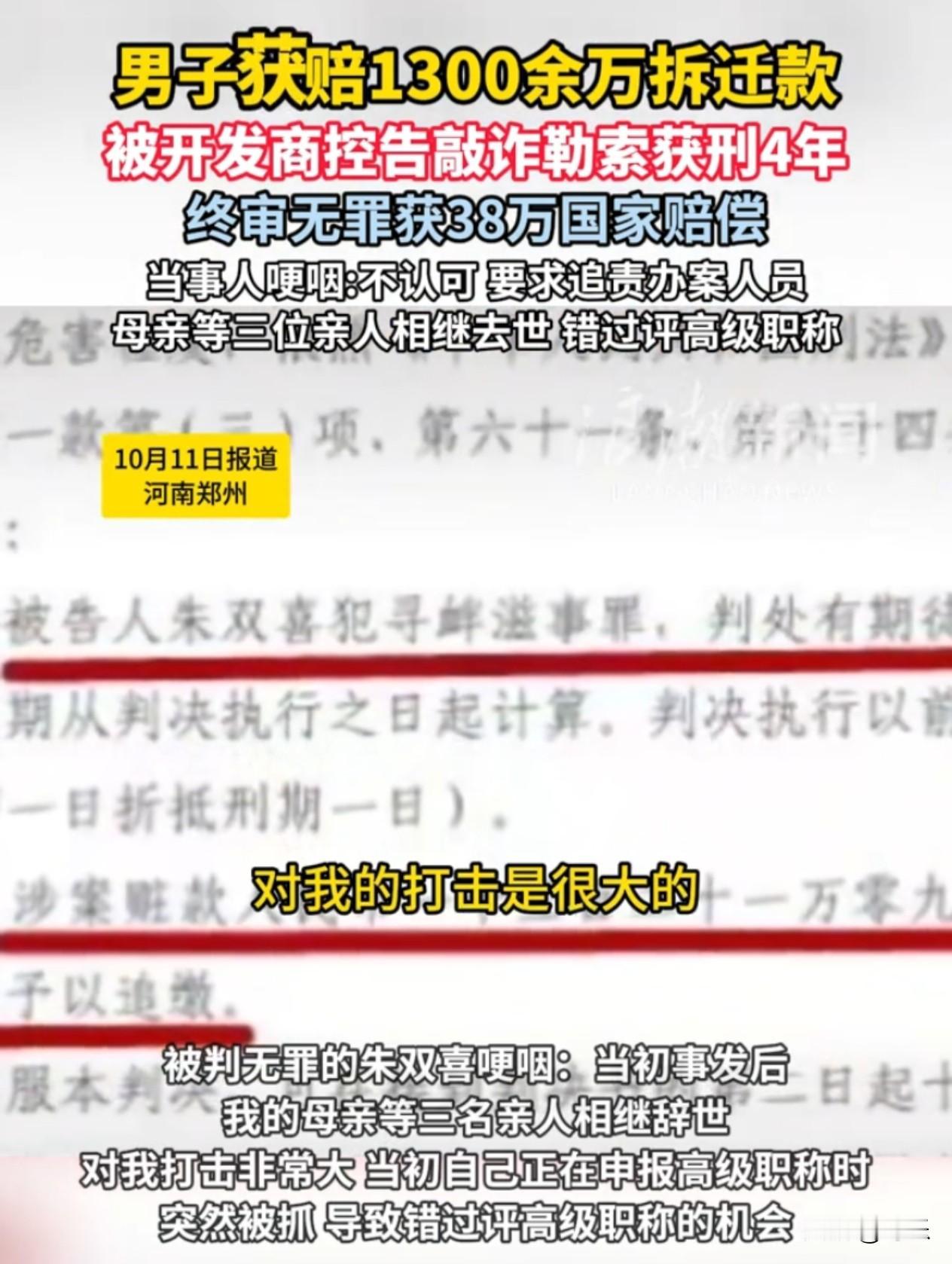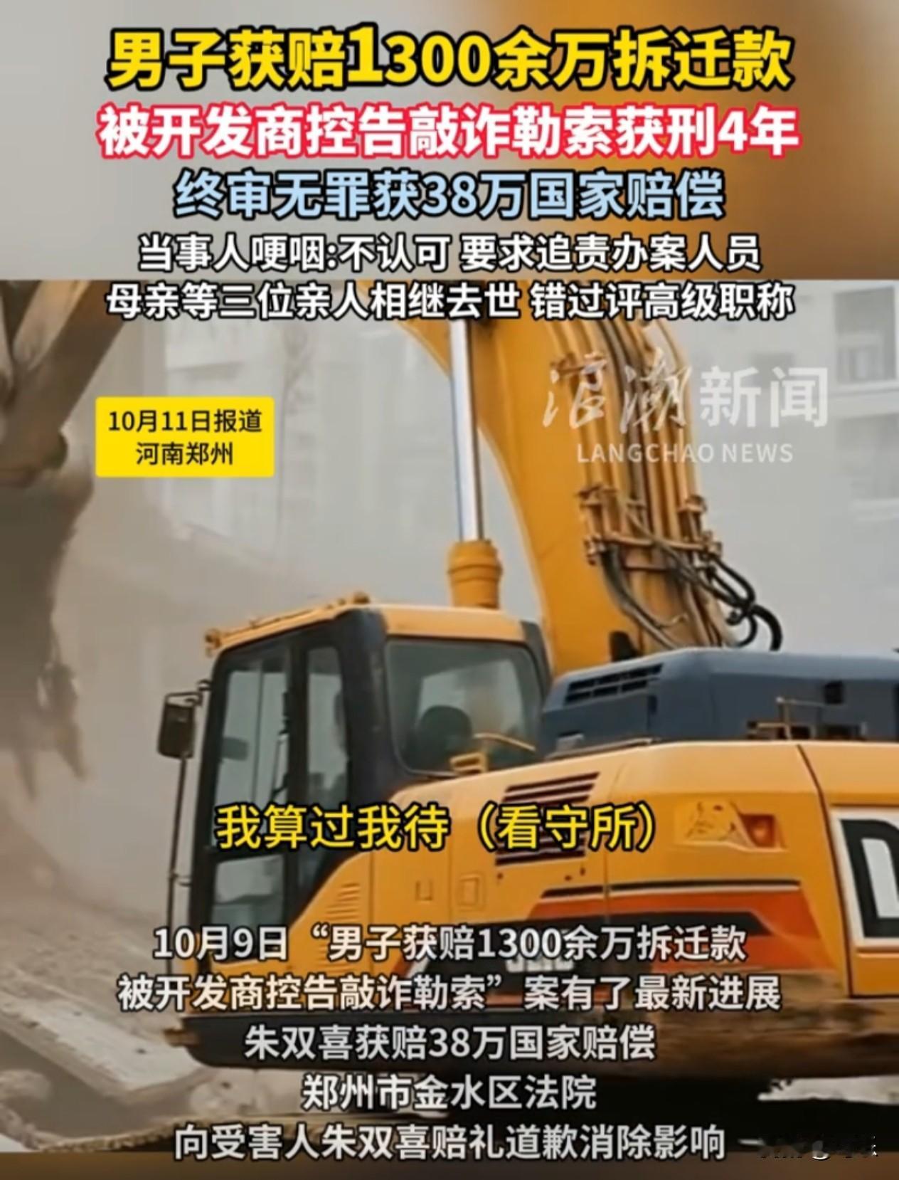 脸都不要了!郑州男子1500平自建房拆迁,开发商承诺补1300万后反告敲诈,他被关541天! 河南郑州,朱双喜这辈子都没想到,自己一砖一瓦盖起来的两栋楼,会把他拖进深渊。 2000到2007年,他攒钱、借钱,亲手盖了一栋五层、一栋六层的自建房,加起来足足1500平,这是他的全部家业。 2012年城中村改造来了,开发商一开始只肯给200平安置房+74万现金,1500平换这点?他怎么算都亏,当场拒签。 这一拒,就是5年。周围的房子全被推平,只剩他家两栋楼孤零零立在废墟里,断水断电,夏天热得中暑,冬天冻得缩成一团,他硬扛着没低头。 后来开发商终于松口,写了承诺书,自愿补他1300多万!拿到承诺的朱双喜搬了家,以为这事总算落定。 谁能想到?两年后,开发商反手报警,说这1300万是被逼的!直接给他扣上“敲诈”的帽子,他被关进看守所,一关就是541天! 看守所里的日子熬人,外头的天塌了:亲人一个接一个走了,熬了半辈子的高级职称泡汤了,好好的家支离破碎。 现在案子还在法院审理,他只能等,等一个公正的说法。 白纸黑字的承诺书,难道就是一张废纸?开发商说反悔就反悔,普通人的权益到底该咋维护? 大家觉得这事到底谁对谁错?遇到拆迁补偿纠纷,咱们老百姓该咋自保?评论区聊聊! 郑州拆迁纠纷 拆迁补偿 百姓权益 契约精神