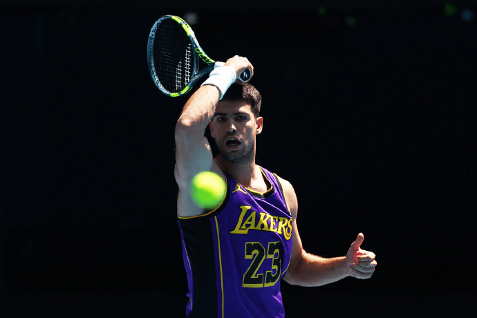 网坛詹密+1?阿尔卡拉斯身穿詹姆斯球衣进行训练