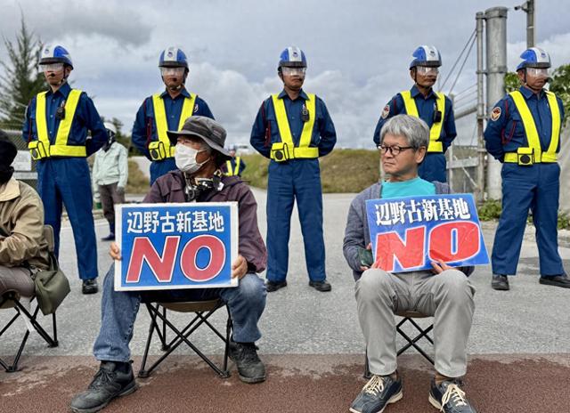 “大海死了,人也会死的!把这些危险的沙土、石材统统拿走!”《环球时报》记者赴名护市采访期间,遇到当地民众自发举行抗议集会,他们手持“边野古新基地NO”“不要在大海上钉木桩”等标语,在边野古美军基地施工区域门口高声演讲、静坐,日本政府雇用的安保人员跨立站成一排,在民众和工地之间筑成一道“人肉围墙”。