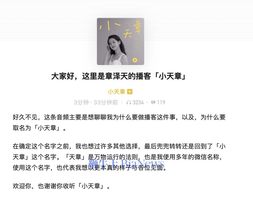 章泽天开通个人播客「小天章」,并发布第一条播客内容