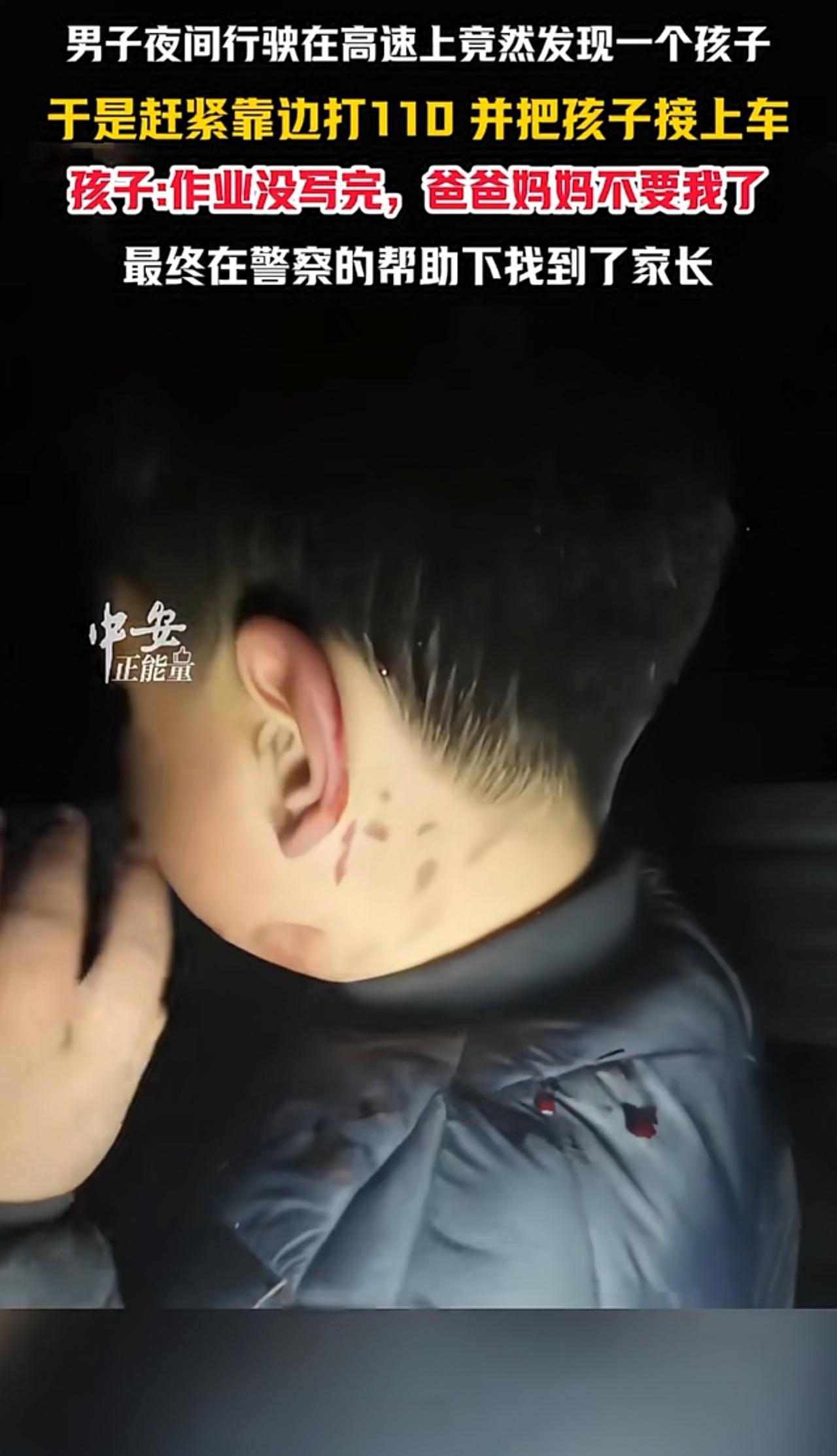 深夜男孩在高速上独自行走被交警拦下。 (作业没写完,爸爸妈妈就不要我了!)[捂脸] 警察叔叔:“哎呀,这孩子都跑到对面去了?不要动,不要动。你怎么一个人在在这在这路上走啊? 男孩哽咽:“爸爸妈妈不要我了!” 警察叔叔:“爸爸妈妈不要你了?你怎么来的?我们先到马路对面去,怎么来的?这从哪里过来的?” 男孩指了指身后:“从那里。” “头上是怎么了?我看一下,你是摔跤了是不是?你走了多久了?” 男孩“走了快半个小时了。 警察叔叔:“这么冷,先上车吧,来,先上车。” 男孩哽咽:“作业没写完,就被爸爸妈妈赶出来了。” 目前视频看到男孩被叔叔带到单位妥善处理。 孩子有什么事,你们后悔都来不及,孩子只是不爱学习,健健康康,平平安安长大,就好了。 但是懒惰是不可取的,作业为什么没写完,一天都时间干啥去了,老师布置的作业一定要写完,不是让你怎么样学习好,但是你学习态度一定要端正。