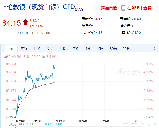 现货白银突破84美元/盎司,日内涨5.09%。纽约期银日内暴涨6.00%,现报84.11美元/盎司。
