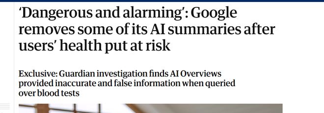 [环球网科技综合报道]1月12日消息,《卫报》调查发现谷歌一些人工智能生成的健康摘要信息存在虚假和误导性,使人们面临伤害风险,随后谷歌删除了部分此类摘要。