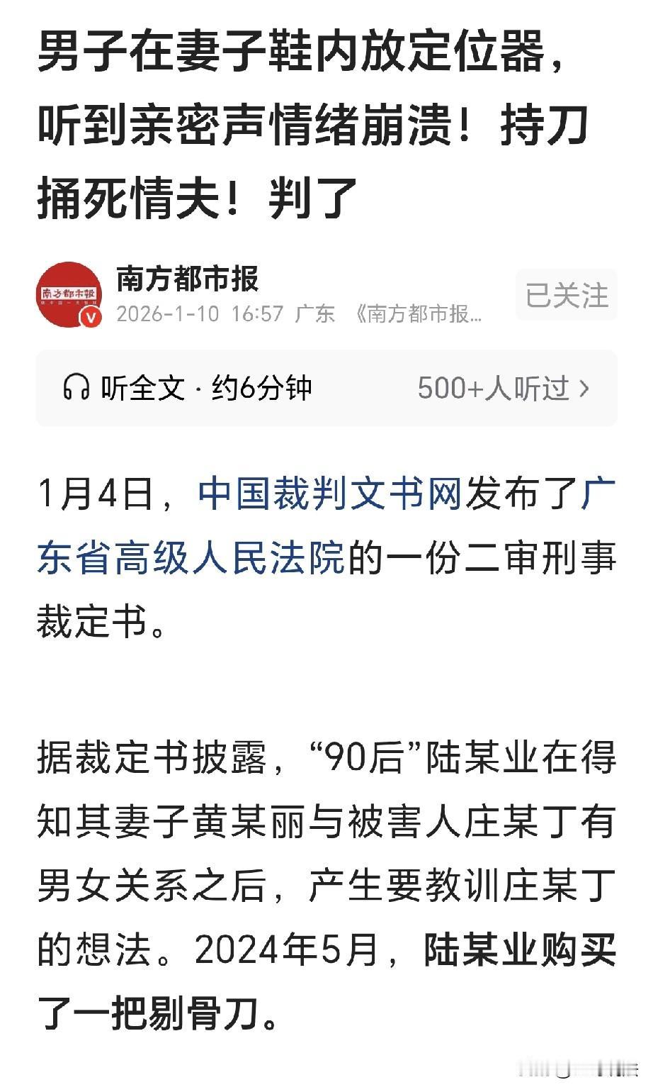 广东深圳,一男子怀疑妻子,悄悄给妻子鞋上装定位器,妻子和人约会,声音全被男子听到,男子揣了把刀子,顺着定位器找到妻子,男子失去理智,冲上去就捅死了妻子的q 夫,法院判了! 2021年9月,黄某丽到一家公司应聘,万万没有想到,老板庄某丁对她一见钟情。 庄某丁表示了好感,他对黄某丽十分的热情,黄某丽十分的心动,没过多久,俩人就越过了防线。 2022年2月,庄某丁和妻子开了一家贸易公司,他想让黄某丽来做公司的财务。 他直言不 讳的告诉妻子,他喜 欢 黄某丽,就是想和黄某丽在一起。 他以为妻子软弱好 欺,可是他丝毫就没考虑,黄某丽还有丈夫,丈夫陆某业可没那么好欺负的。 陆某业发现,黄某丽最近行动 怪 异,她不管家,也不管孩子,她除了上班,下班也不回来。 陆某业有了怀疑,难道妻子有了别人? 为了证实自己的猜疑,他买了监 听 器悄悄搁在妻子包里。 黄某丽没有察觉,2024年4月17日,她背着小包就出门去。 她和庄某丁约 会,声 音 顺着监 听 器传到陆某业的耳里。 陆某业火冒三丈,看来妻子早就背 叛了家庭! 到了晚上,黄某丽回到了家里,她整理包包,突然就发现了那个小小的监 听 器。 她大吃一惊,原来丈夫早就怀 疑,她心里害怕,唯 恐 丈夫会伤害自己。 果然不出她所料,陆某业对她大发脾气,说她在外面约会,声音早就被他听的一清二楚。 陆某业问她,那个人到底是谁?黄某丽自知有愧,她低下了头,承认对方就是老板庄某丁。 陆某业火冒三丈,这个家你还要不要了?如果你悬崖勒马,现在就和庄某丁断绝关系,这次我就原谅,今后我们好好过日子。 黄某丽点了点头,按照陆某业的要求,给庄某丁发了条分手的消息。 可庄某丁不愿意了,他态度坚决,无论如何,他也要和黄某丽在一起! 庄某丁还表示,这事还会牵连你们的孩子! 黄某丽心里害怕,她又转念一想,自己心里对庄某丁仍有情义。 于是两人约定,以后要做的更加yin蔽,从此以后,他们每周日只见一次。 陆某业对黄某丽并不放心,他做好了打算,如果庄某丁和妻子还是继续,自己一定要给他个教训! 2024年5月,陆某业买了一把刀子,他下定决心,如果再被我发现,绝对不会饶过你们! 2024年6月16日,陆某业把D 位 器装进黄某丽的鞋子,他倒要看看,妻子周末到底去了哪里。 黄某丽打扮漂亮,上午10点,庄某丁开车到楼下接她,俩人径直来到了酒店房间。 到了下午6点半左右,二人离开酒店,来到一处静悄悄的河边。 这里人少安静,庄某丁放心的拉着黄某丽慢慢的散步。 谁知他们没有想到,陆某业通过定d 位 器监 听 功能,再一次听到了他们在一起的声音! 陆某业忍无可忍,立刻将刀放进电动车后尾箱里。 他骑上电动车就一路飞奔,根据定位找到了河边。 离得老远,陆某业就看到了妻子,他还看到俩人牵手在河边散步! 陆某业怒不可遏,自己一直被这俩人欺骗,他瞬间就失去了理智: 你们欺人太甚,今天非要做个了断! 他拿出那把刀子,悄悄的来到了二人的附近。 他趁俩人毫无防备,拿着刀子就冲了上去,他对着庄某丁后背 捅 了一刀,随即又抽出刀来。 庄某丁转过来想看是谁,陆某业又朝他 捅了一刀,庄某丁倒在了地上。 黄某丽吓得大叫,立刻拨打了120急救,陆某业没有逃走,他自己拨打了报警电话。 陆某业告诉警方,是庄某丁把自己的妻子给睡了,因此他拿刀捅了对方。 陆某业在现场等待,他对黄某丽说,我已经说过了叫你停止! 救护车赶来,发现庄某丁已经死亡。经过鉴定,庄某丁是被 锐 器所伤。 他内脏多处破裂,导致大出血 死亡。 《刑法》第234条规定,故意伤害他人身体致人死亡,处十年以上有期徒刑、无期徒刑或者死刑 。 陆某业因妻子和庄某丁约,会,持刀捅到庄某丁的背部,导致庄某丁内 脏 破 裂,大出血死亡。 陆某业主观上具有伤害他人身体的故意,而非直接追求其死亡结果,符合故意伤害罪的条件。 但是,陆某业的行为导致庄某丁内脏破裂大出血死亡,伤害行为与死亡结果存在直接因果关系。 因此,一审法院以故意伤害罪,判处陆某业无期徒刑。 陆某业不服,提起上诉。 《刑法》第67条规定,犯罪以后自动投案,如实供述自己的罪行的,是自首。对于自首的犯罪分子,可以从轻或者减轻处罚 。 陆某业认为,自己作案后未逃离现场,并主动拨打了报警电话,归案后也如实供述了犯罪事实,符合自首的法定条件,因此应该从轻处罚。 二审认为,一审法院已经考虑到了自首情节以及被害人也有过错。 因此在十年以上有期徒刑、无期徒刑、死刑之间,选择了判处陆某业无期徒刑。 二审驳回了陆某业的上诉,维持了一审。 对此,你怎么看? 关注@王哥说法 多学法律少吃亏!