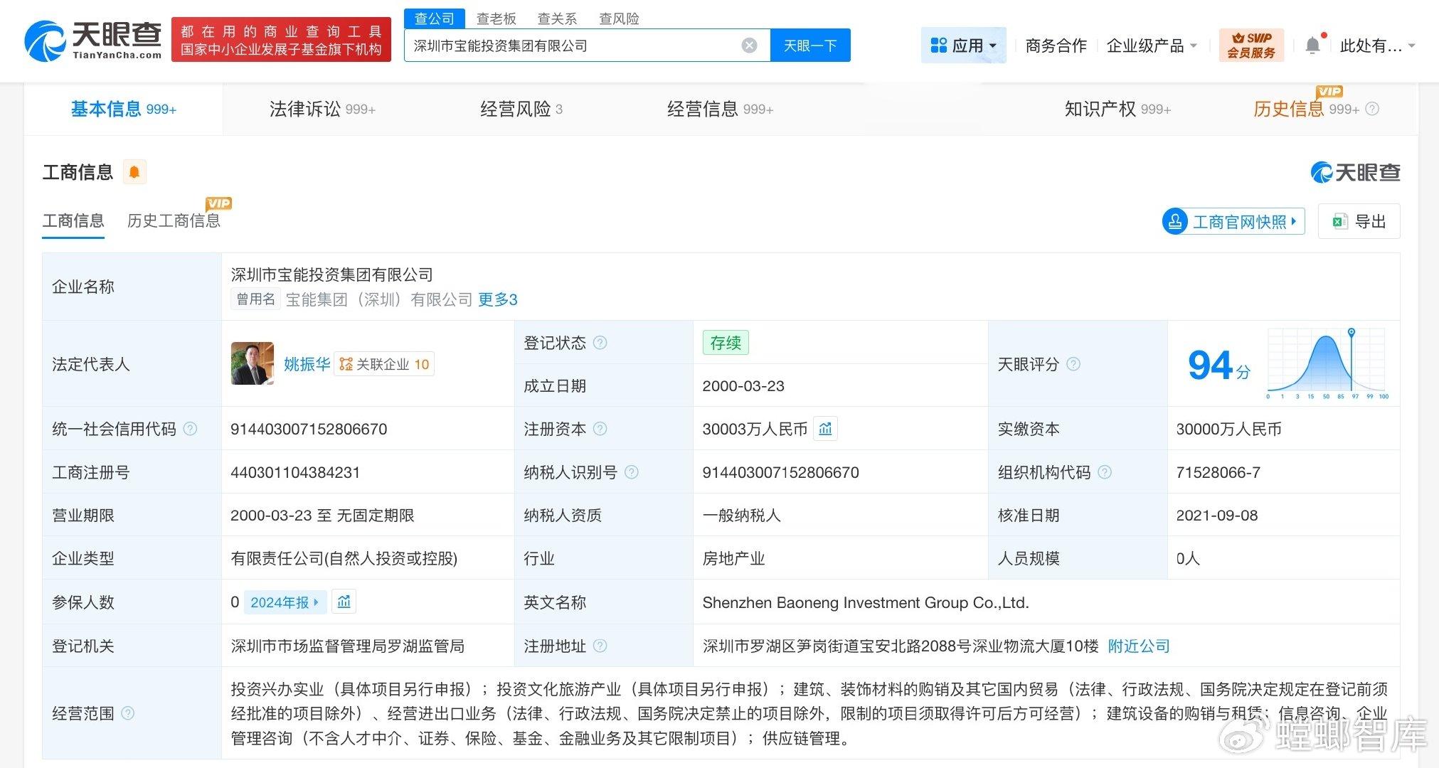 深圳市宝能投资集团有限公司成立于2000年3月,法定代表人为姚振华,注册资本约3亿人民币,经营范围含投资兴办实业,投资文化旅游产业,建筑、装饰材料的购销及其它国内贸易等。股东信息显示,该公司由姚振华、深圳赛康资产管理有限公司共同持股。