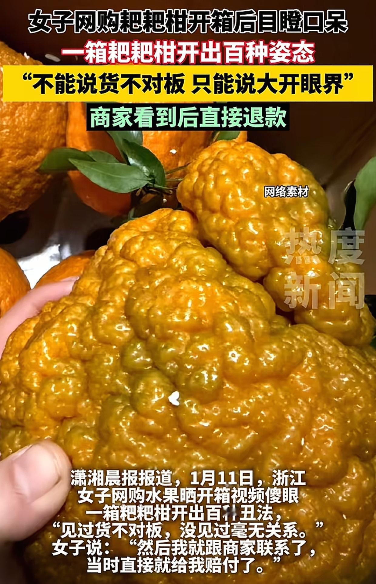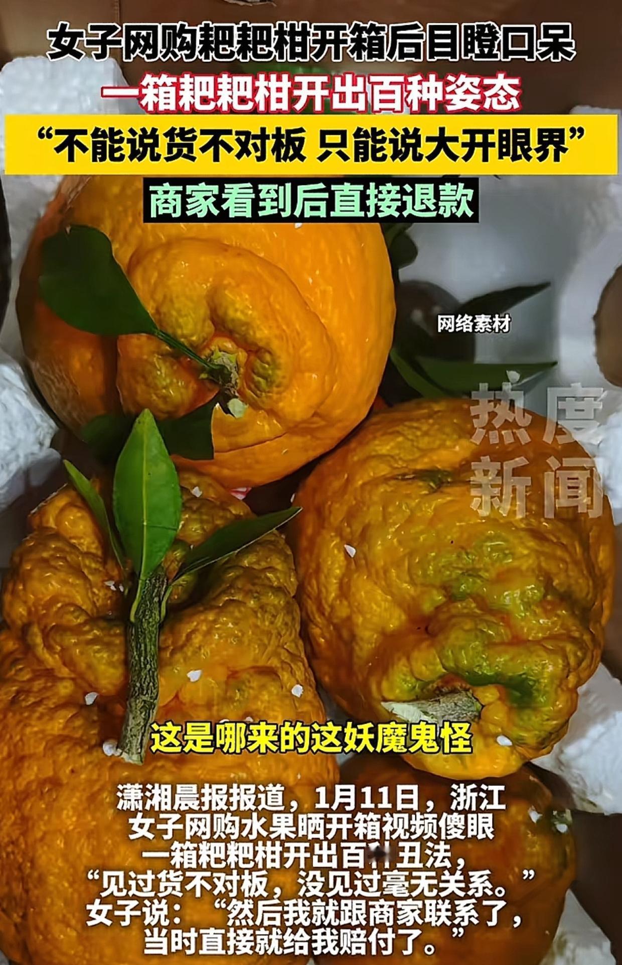 浙江女子花20多元网购了一箱耙耙柑,收到货后目瞪口呆。只见耙耙柑个个奇形怪状,没