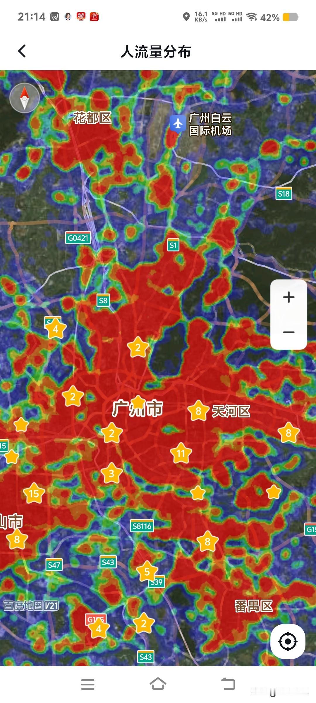 广州比深圳大几倍,热力图也大很多,但是常住人口比深圳才多了一百来万。看来还是深圳