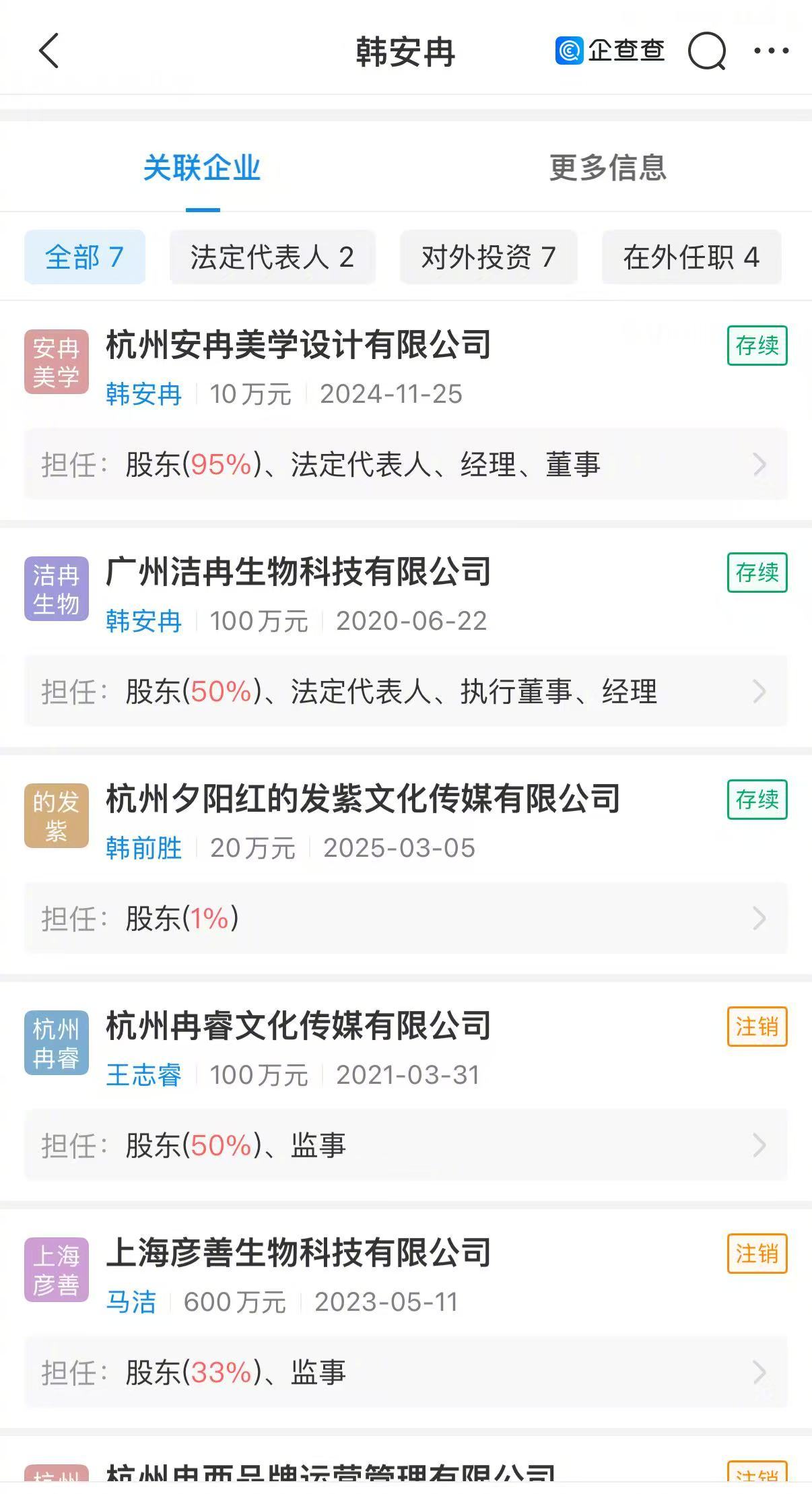 [#韩安冉名下7家公司4家已注销#]1月12日,#韩安冉宋浩然账号被封#韩安冉与宋浩然账号被封的消息引发关注。#韩安冉回应#企查查APP显示,目前韩安冉名下共关联7家公司,其中4家已注销,杭州安冉美学设计有限公司、广州洁冉生物科技有限公司、杭州夕阳红的发紫文化传媒有限公司为存续状态,韩安冉在上述公司担任经理、董事等职务。(记者张楠)
