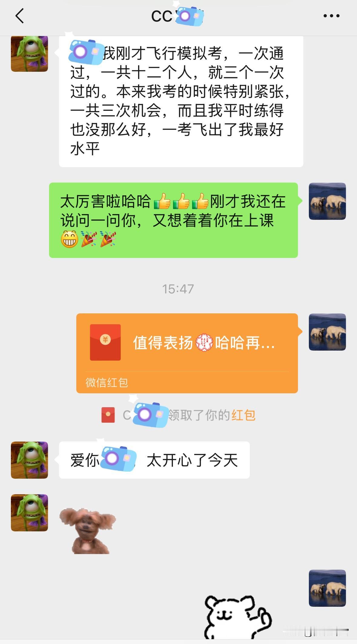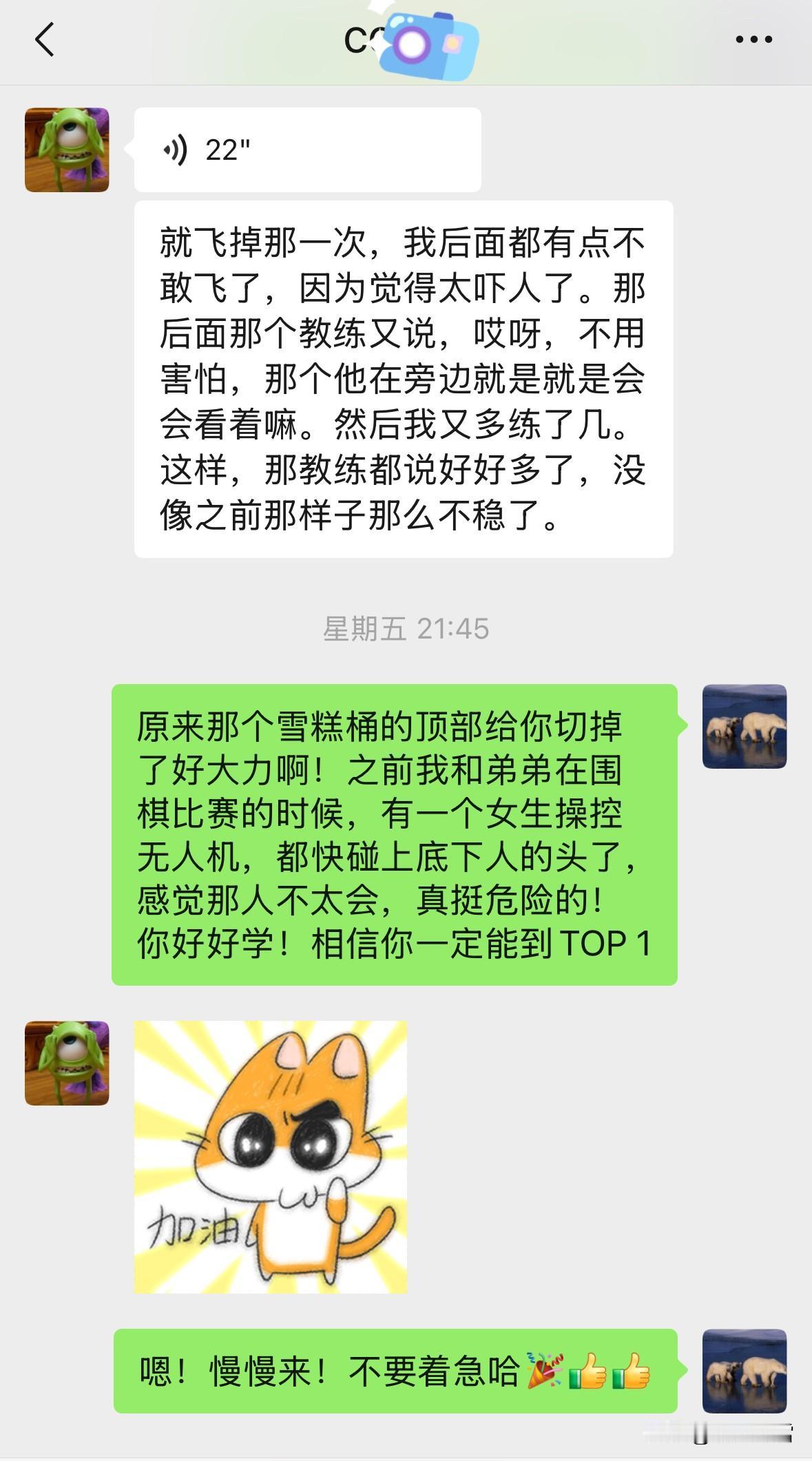 考飞手不那么简单!每天长时间户外训练,课余电脑上狂刷题。训练的第二天,还出了一些小状况,操控的无人机切掉了一个雪糕筒的顶部。可想而知机翼的力度,她吓坏了!教练一旁不断鼓励说“别担心,很常见!练练就好了!”果然,之后明显好多了。 今天下午,她们进行一项模拟考核,她是最先通过的三人之一(一次性通过),高兴地马上给我通报这一好消息!很多时候,付出了超乎的辛勤之后,收获的果实会更甜[星星眼]。 要珍惜那种能给予我们意志胆量及能力思想上的突破,会令我们加倍成长,伴随发自内心的快乐。我们要有意识地寻求到这样的前进方向,随之而来的行动力、自信力和正能量,构筑出更大的一个自我框架。当然,我们应坚决摒弃那些带给自身负能量的东西[奋斗]。 为奖励她,给她发了一个红包,祝她更上一层楼,我相信她是最终TOP 1,不论男女[加油]。