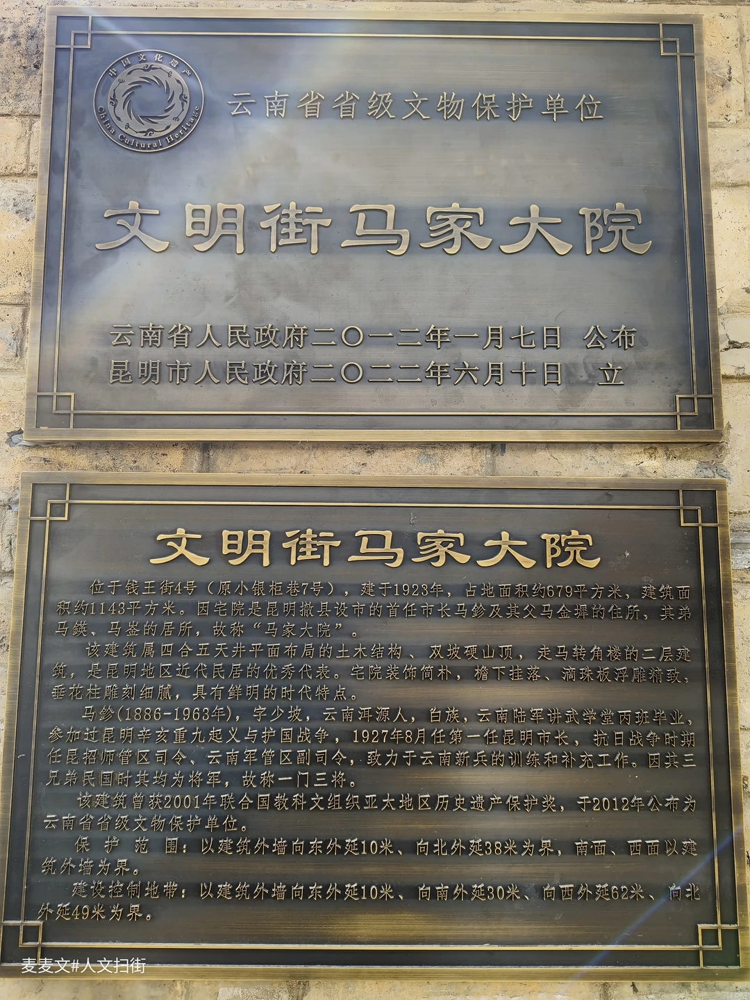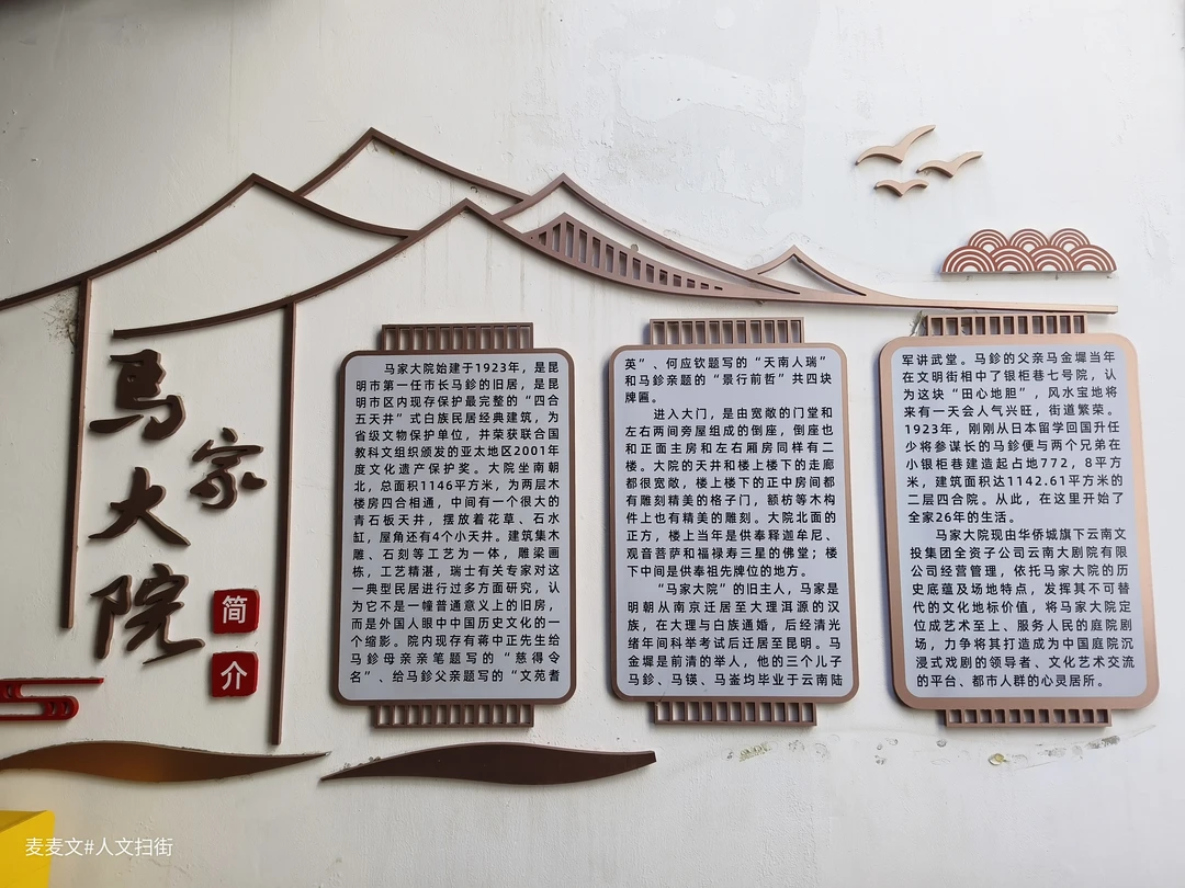 马家大院始建于1923年,是云南省昆明市第一任市长马鈴的旧居,是昆明市区内现存保护最完整的“四合五天井”式白族民居经典建筑,为省级文物保护单位,并荣获联合国教科文组织颁发的亚太地区2001年度文化遗产保护奖。