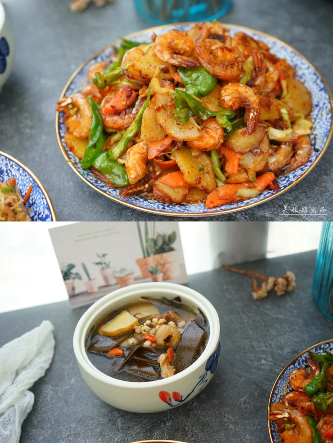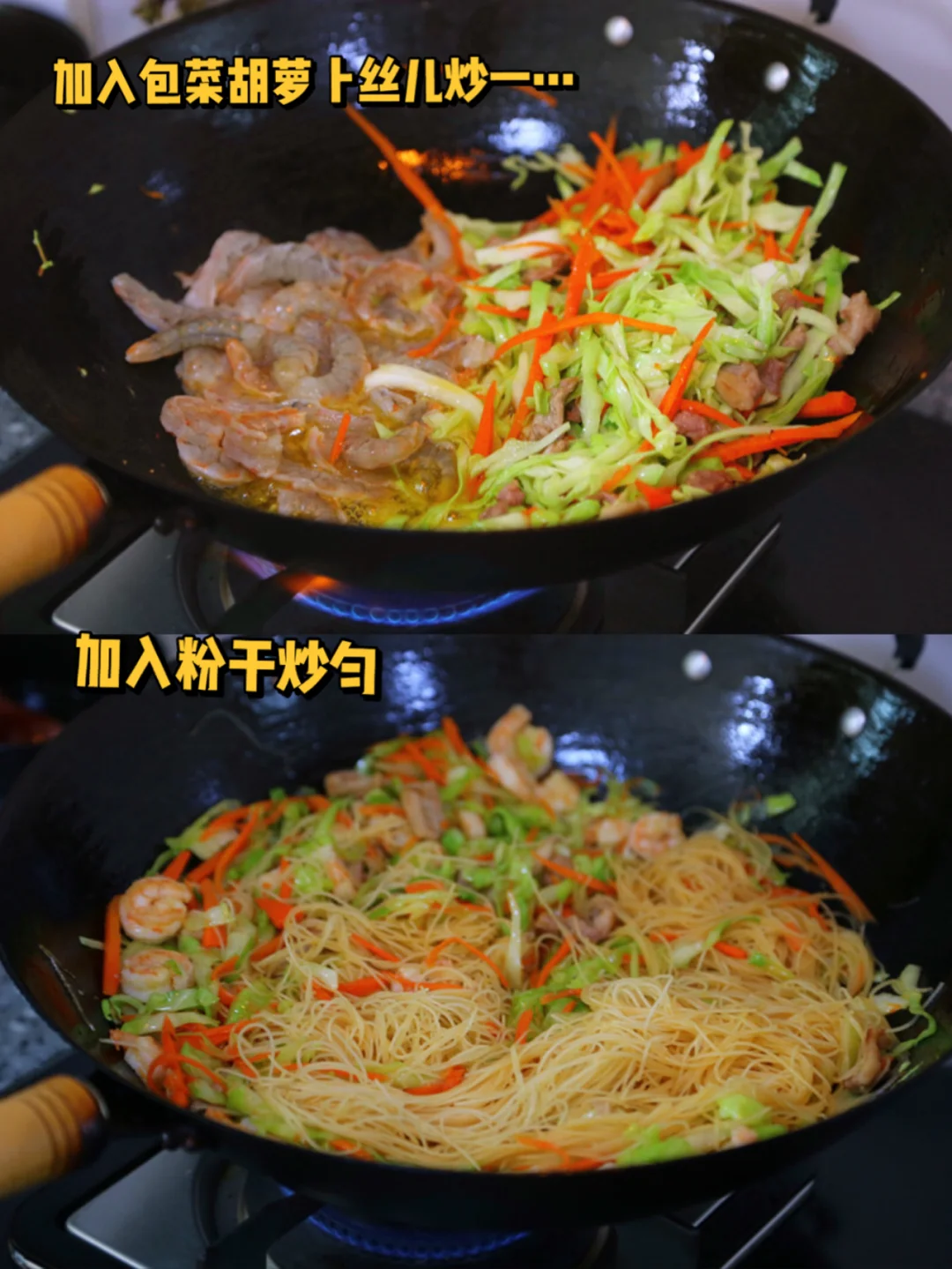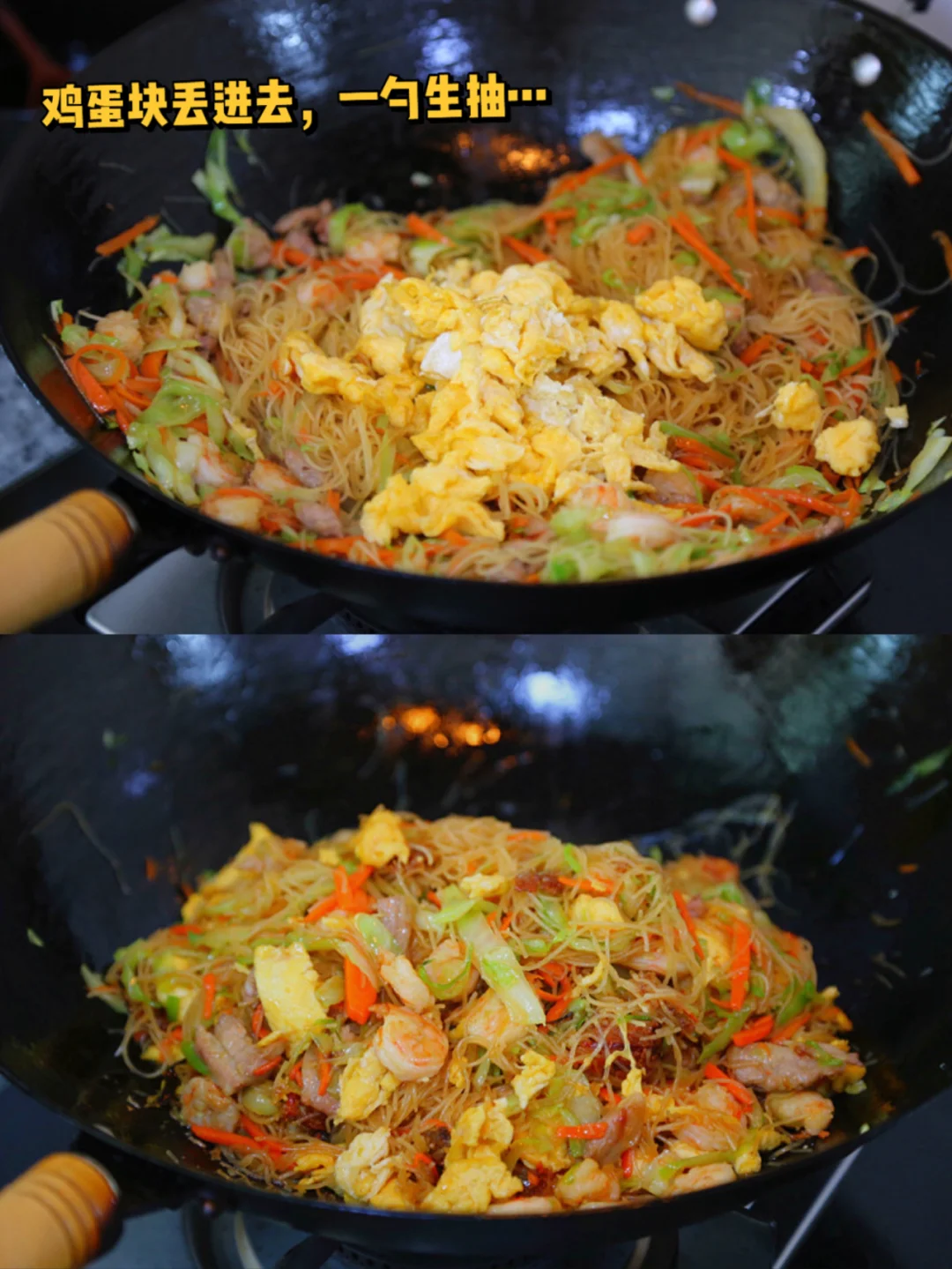 虾仁容易熟蔬菜五成熟的时候扒拉在一边,另一边虾丢进去炒熟,然后粉干倒进去,炒好的鸡蛋块也丢进去