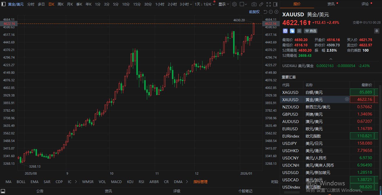 格隆汇1月13日|由于对美联储独立性及地缘政治风险的担忧,现货黄金站上4630美元/盎司,日内涨幅达2.46%;现货白银突破86美元/盎司,日内涨7.62%。
