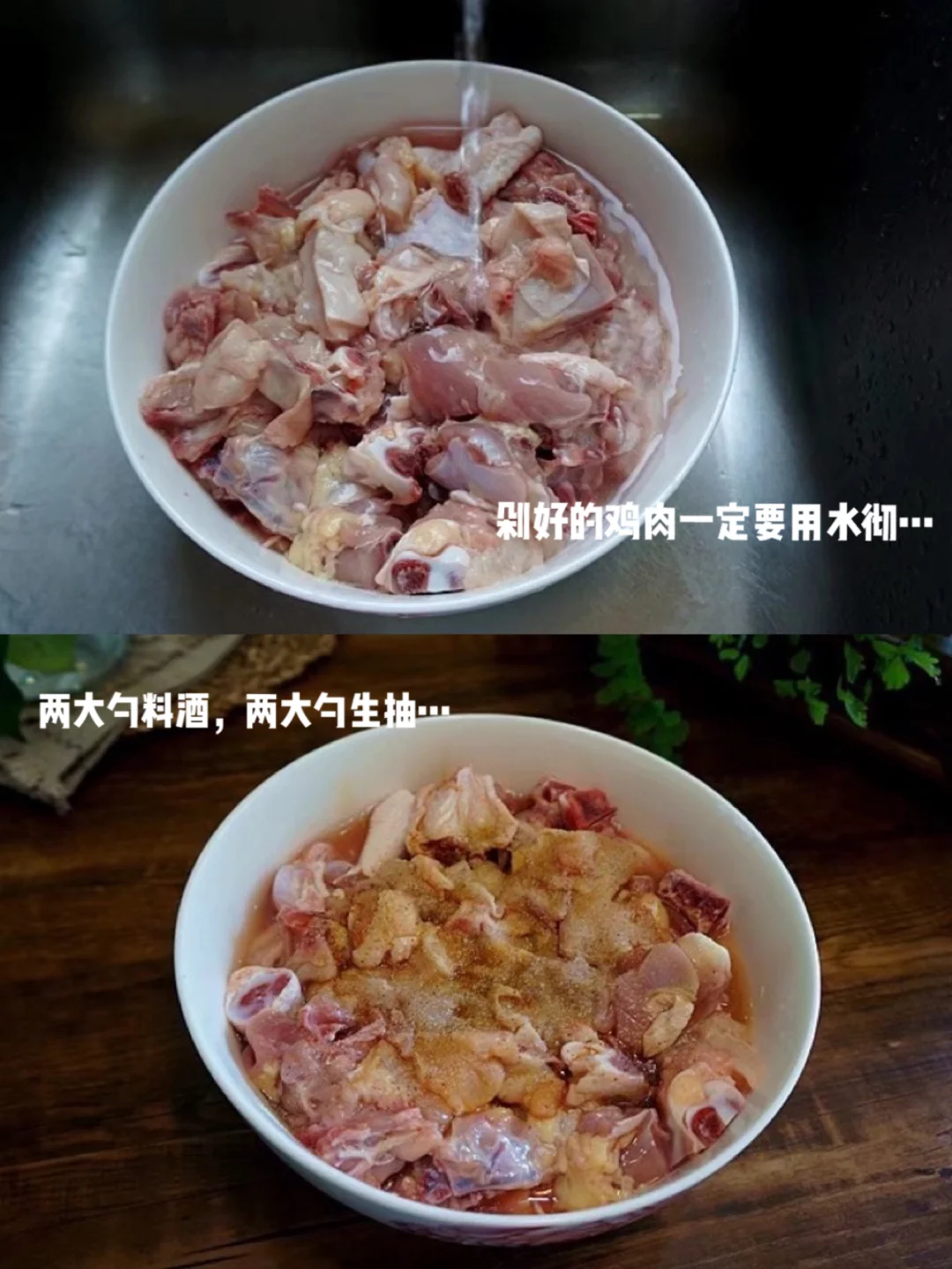 4.鸡肉块儿的碗里加入两大勺料酒,两大勺生抽,少许胡椒粉和适量盐,用手搅拌匀 腌制十五分钟 期间也要搅拌一下,这样才能每块鸡肉味道均匀
