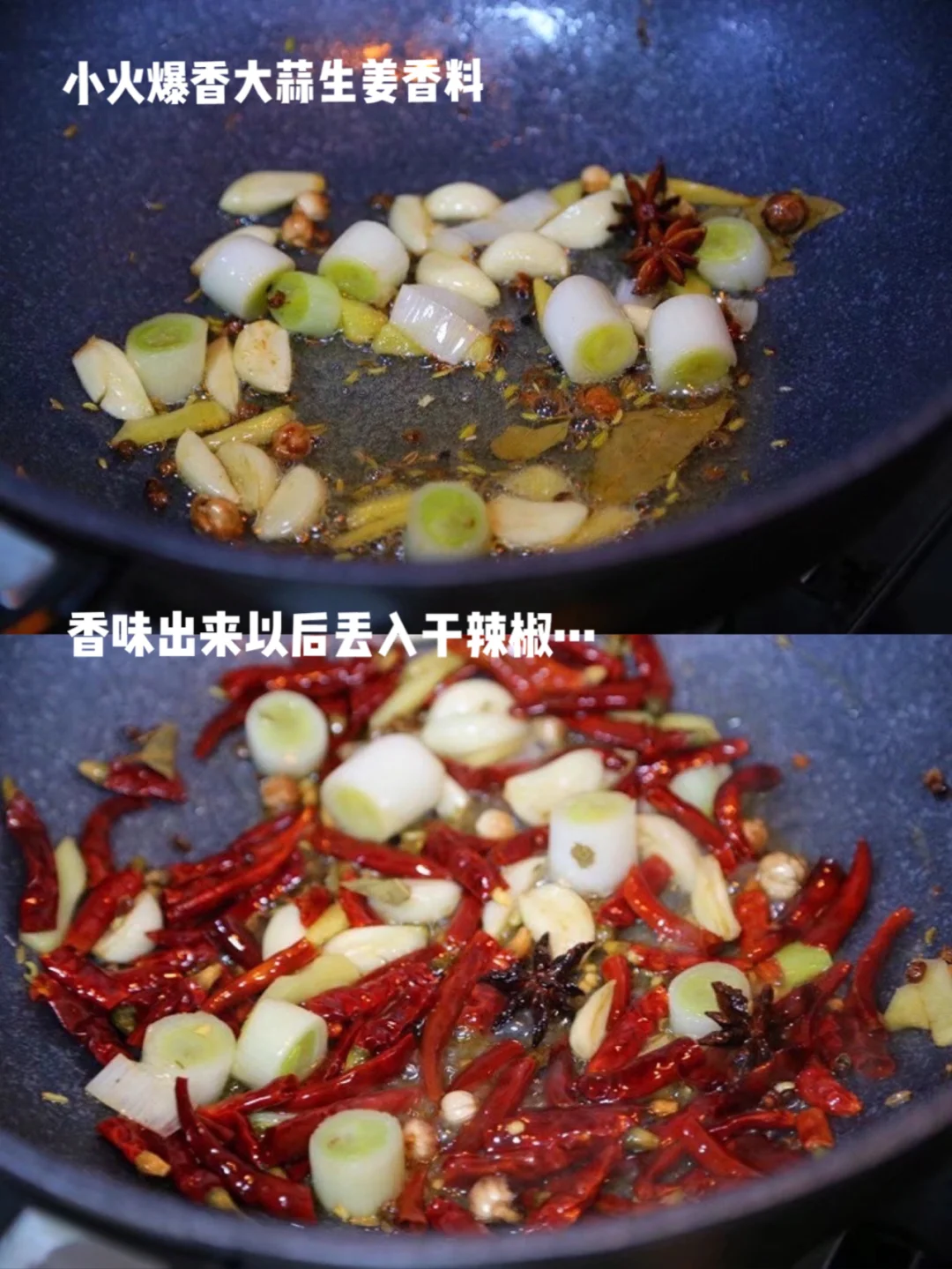 12.重新洗锅上油,大蒜生姜片大葱段香料一起小火爆香,一定要小火 花椒可以多一些哦,特意放了朋友四川带给我的特别香的